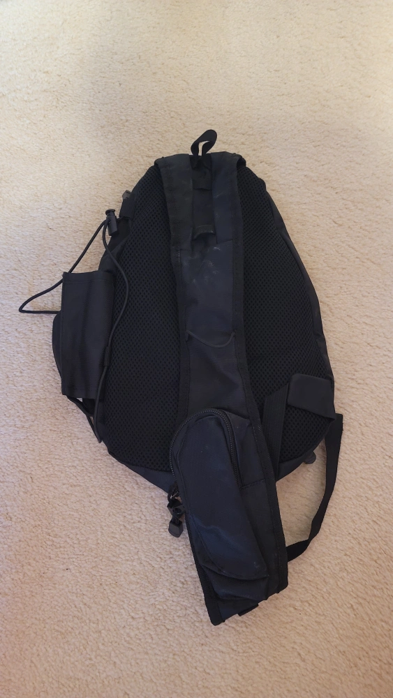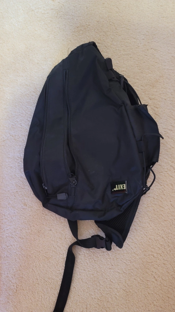 A black sling bag with multiple pockets and zippers. It is made of a nylon fabric. It has a mesh panel on the back. It has an adjustable shoulder strap. The bag measures approximately 12 inches in length and 10 inches in width. It has the word "EXIT" in green on the front. The bag is in used condition. Good for biking or outdoor activities.