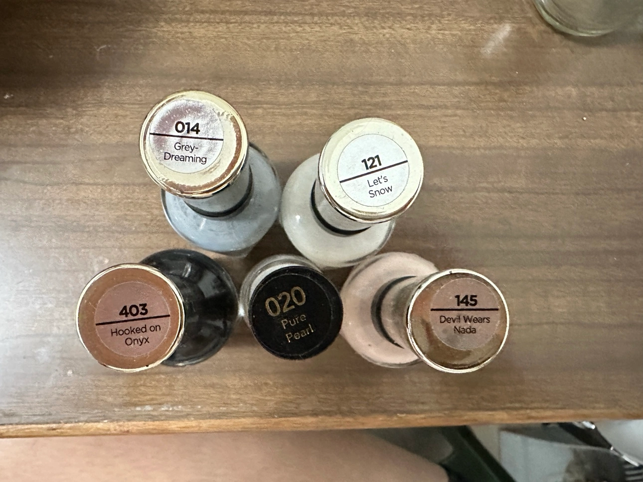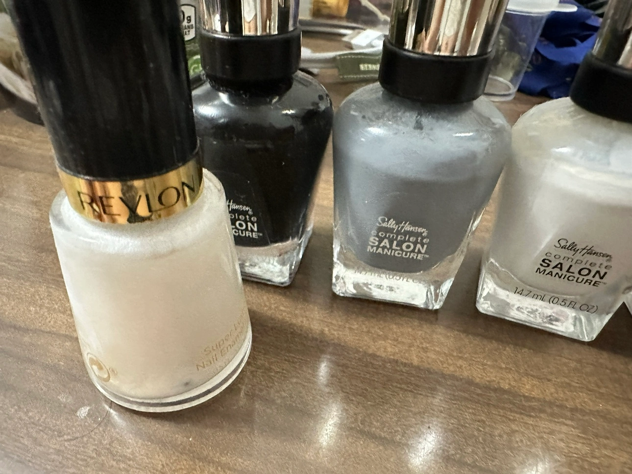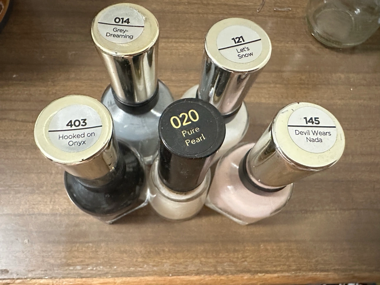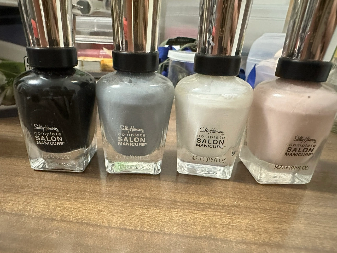 Four bottles of Sally Hansen Complete Salon Manicure nail polish in the colours: Hooked on Onyx, Grey Dreaming, Let's Snow, and Devil Wears Nada. And a bottle of Revlon pure pearl Barely used Take all of it for $3
