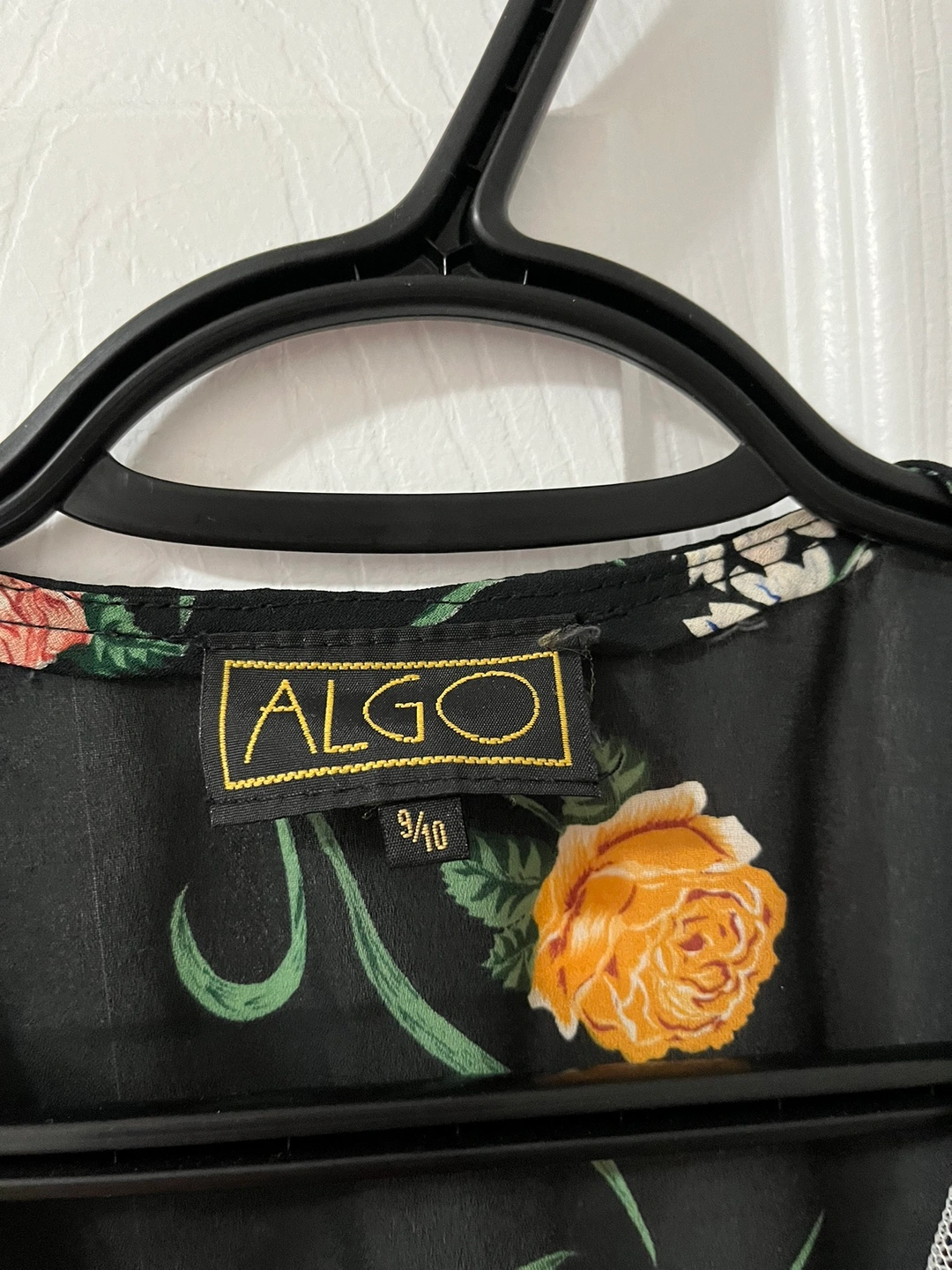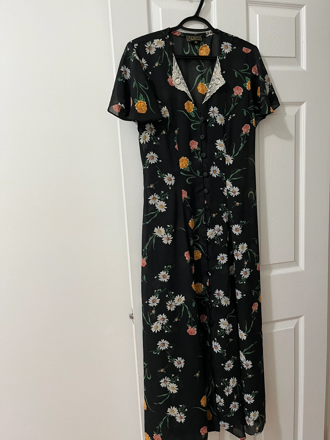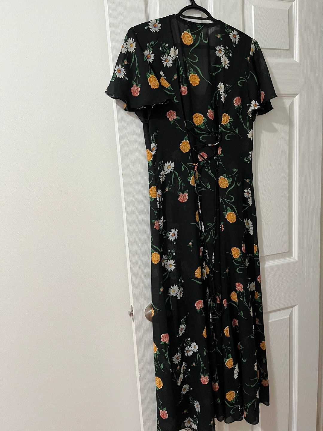 Black floral long dress with a lace trim at the neckline. The dress has a button up front, a tie at the back, and short sleeves. It's made of a lightweight fabric, perfect for warmer weather or beach. Size 9/10.