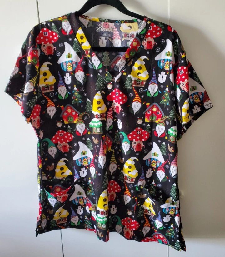 This is a women's size XL Christmas gnome scrubs top. It features a V-neck and short sleeves. The top has two pockets. The top is made of a soft and comfortable fabric. It is perfect for the holidays. Worn once.