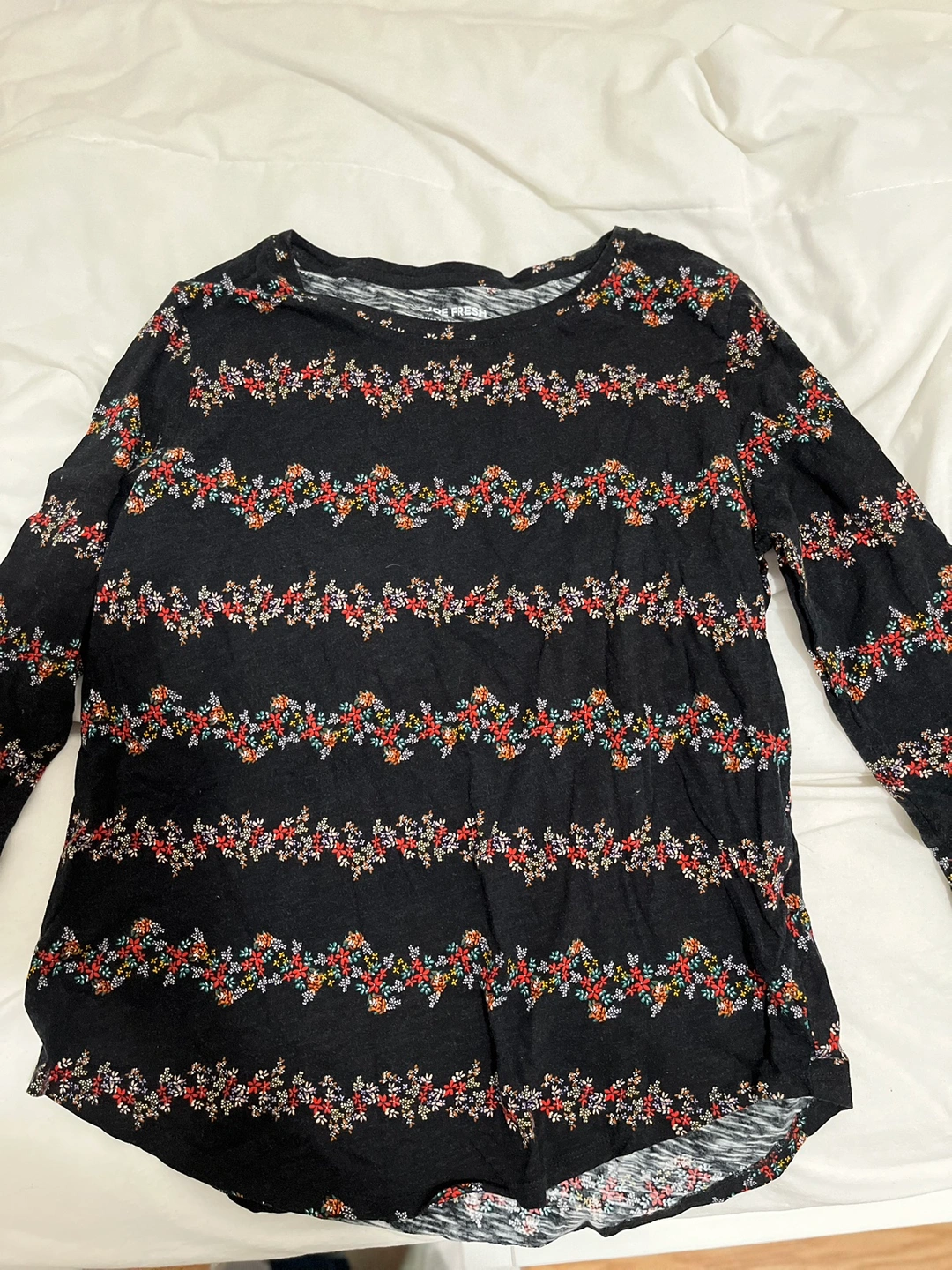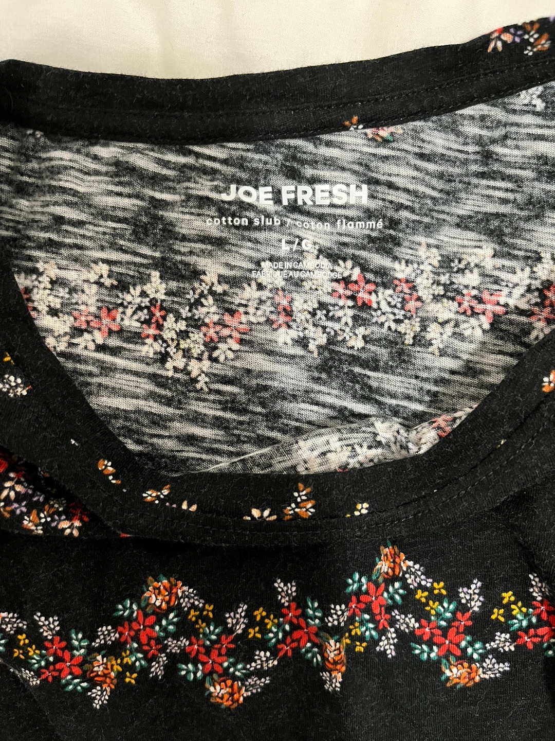 Black long sleeve shirt with floral pattern. Size L/G. Cotton and cotton/flammable blend