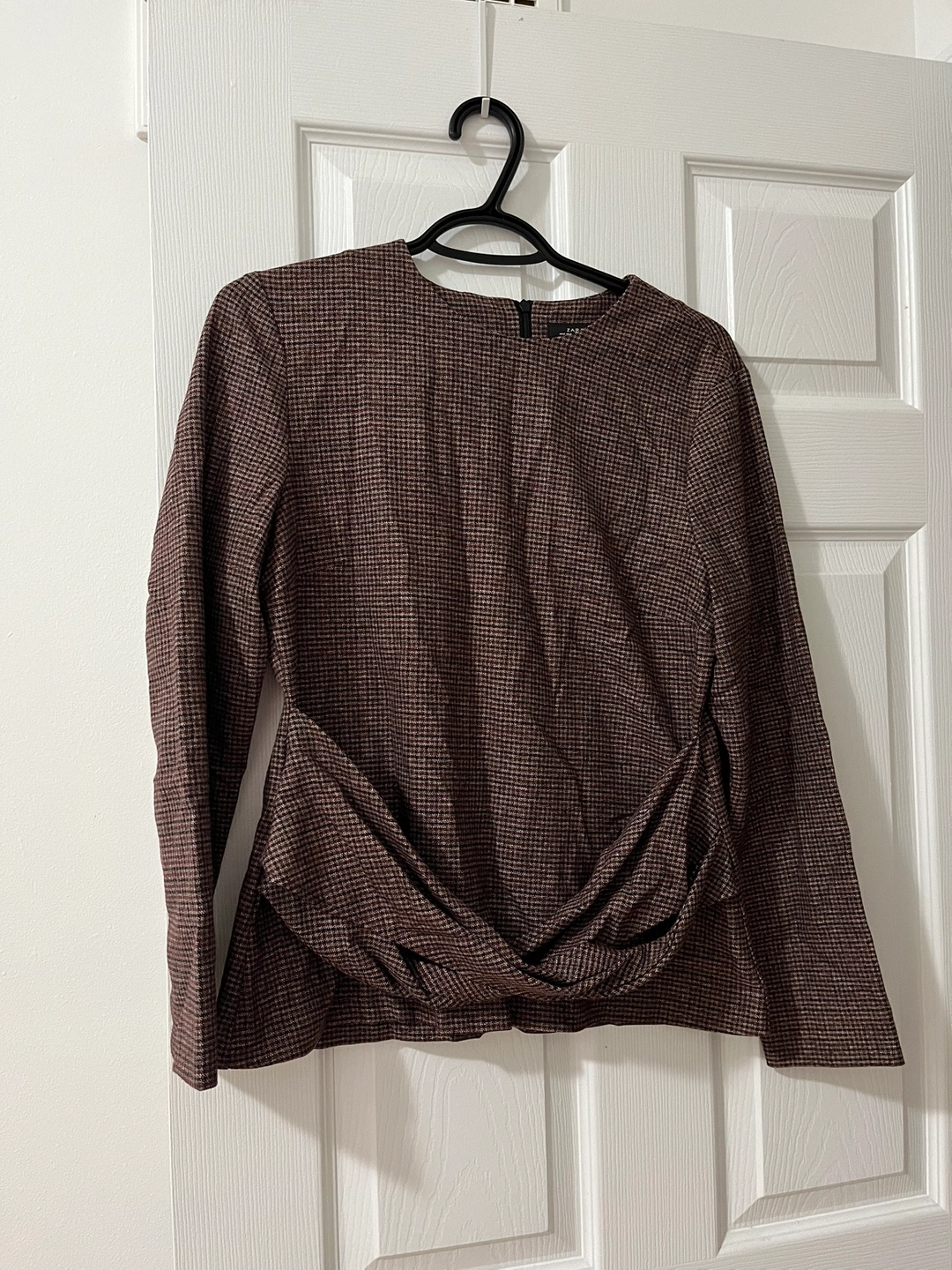 A brown and black plaid blouse with a tie detail at the front. The blouse has long sleeves.