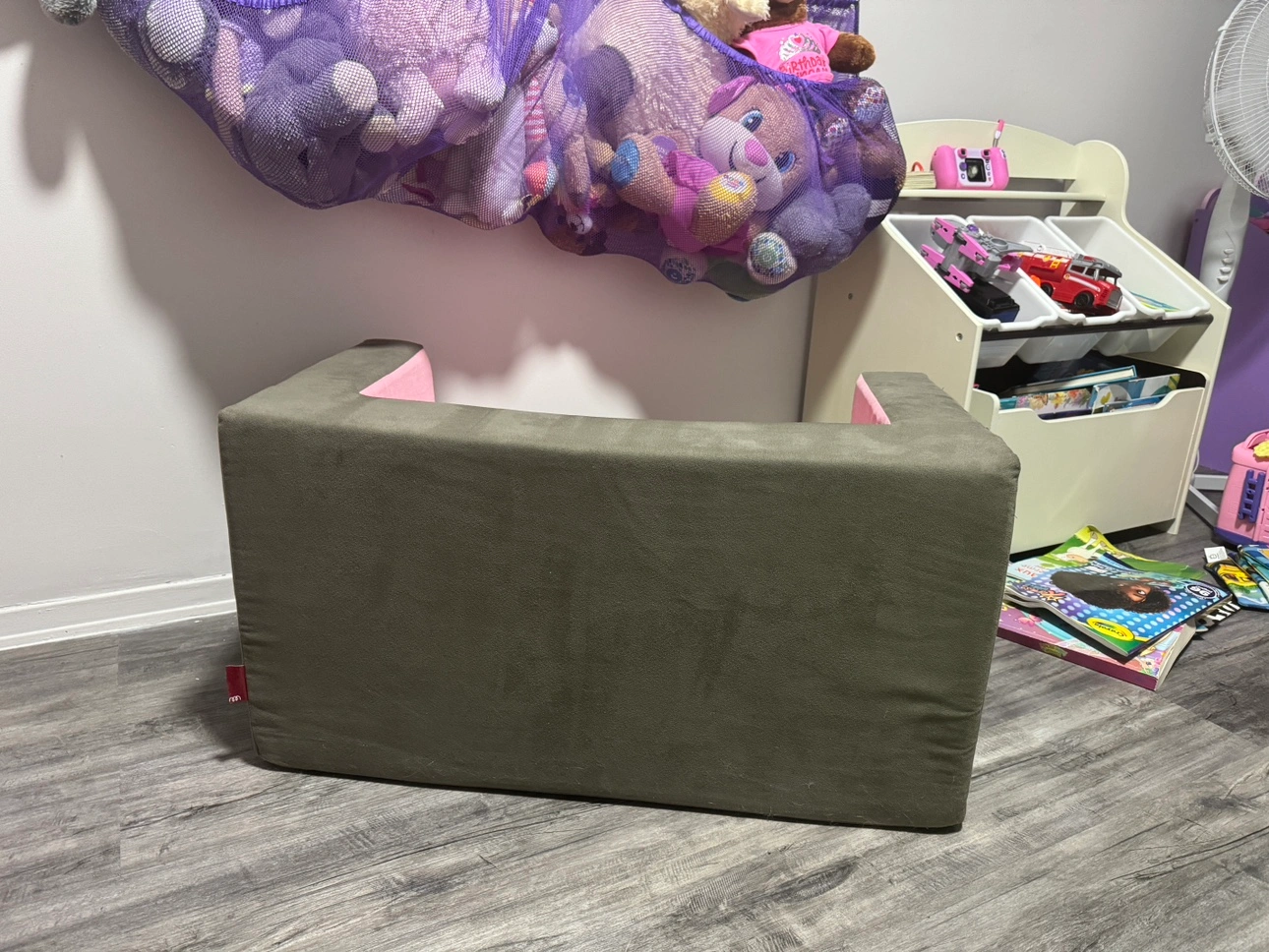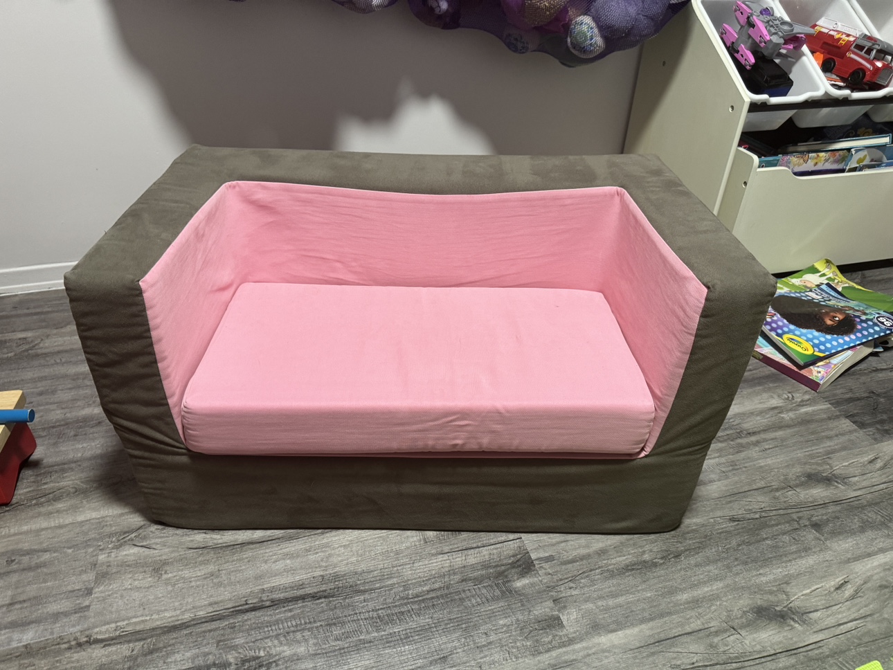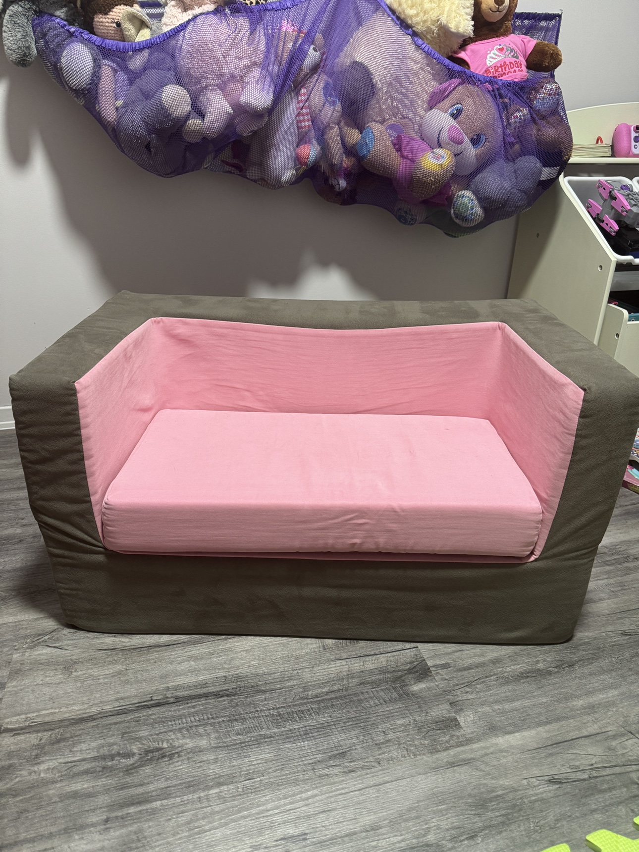 Pink and Brown children's couch. Perfect for a playroom or bedroom. It is comfortable and durable, and will be enjoyed by any child.