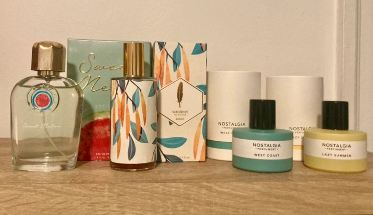 From left to right $10 each Preferred Fragrances Sweet Melon 100ml (Tom Ford Lost Cherry dupe) Wanderer Soleil 100ml Nostalgia Perfumery West Coast 60ml Nostalgia Perfumery Lazy Summer 60ml