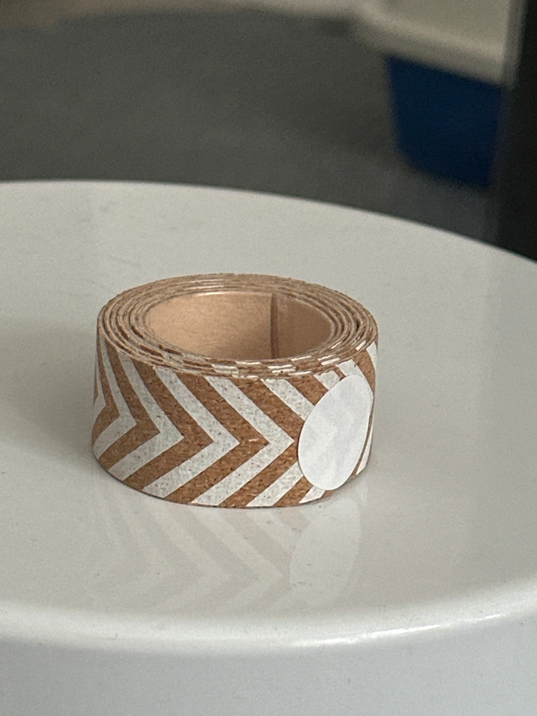This roll of tape has a chevron pattern in brown and white. It is made of cork. Ive never used it before. It has a plastic backing so dont worry about it not being sticky. Free with purchase of something else in my listings