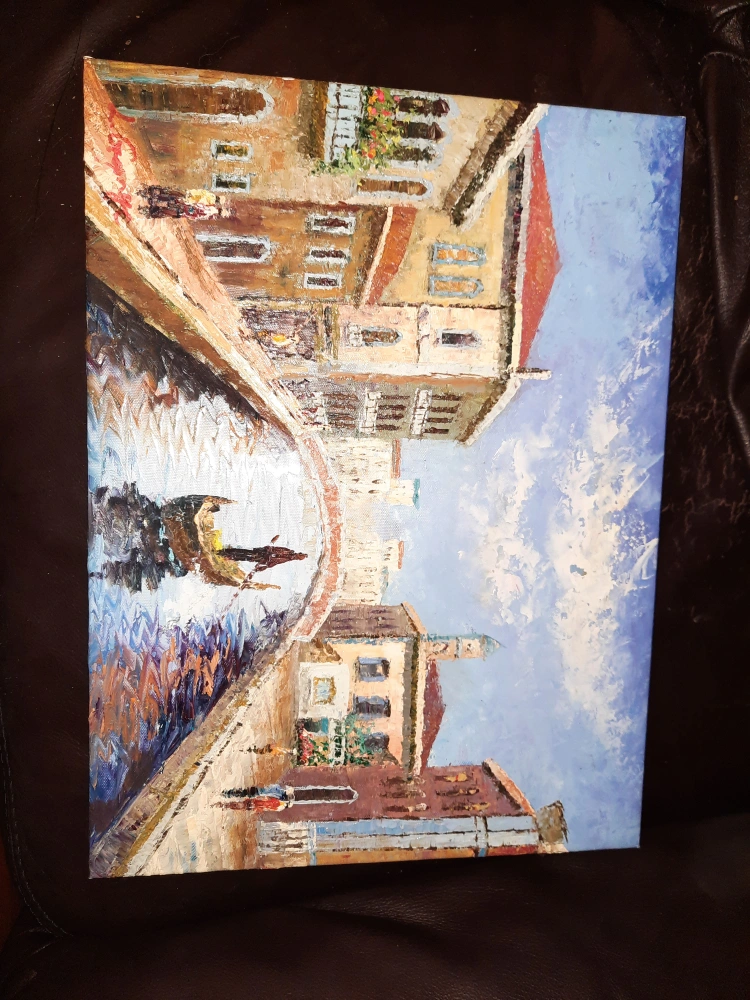 An oil painting of a canal in Venice. The painting is approximately 16 x 12 inches. real painting