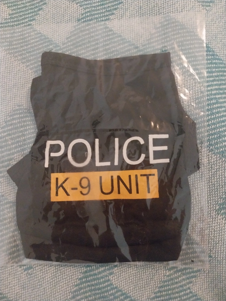 Black vest with "Police" and "K-9 Unit" printed in white and yellow on the front. Xtra small dog size.