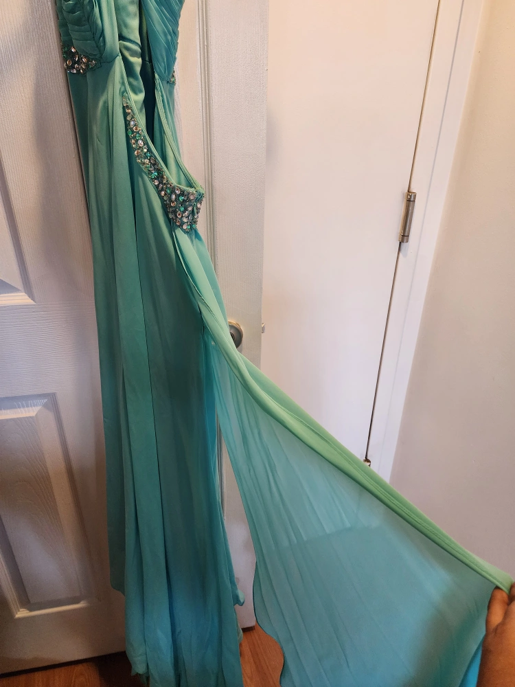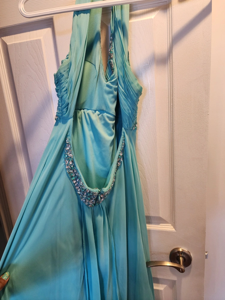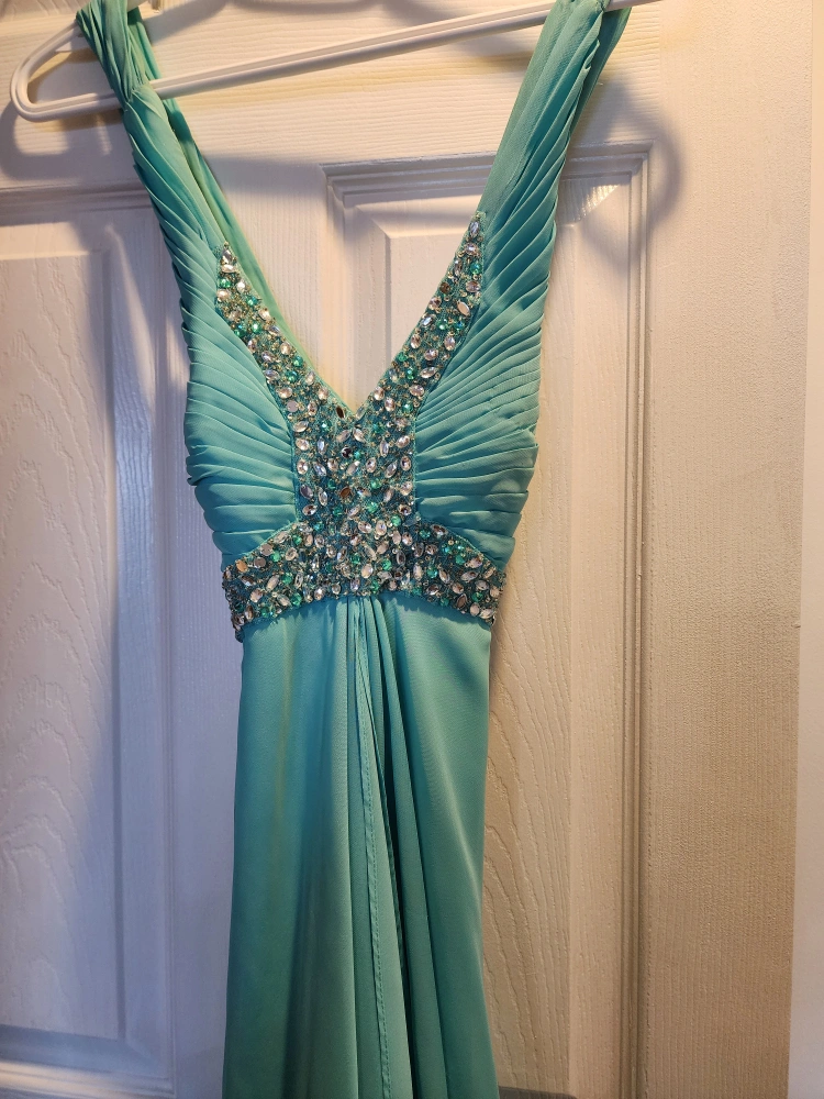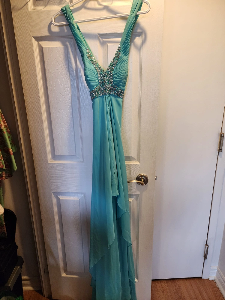Size US 2. In perfect condition, only worn once. Was originally $250 Is criss-cross in the top of your back and then backless.Has a small train at the back of it.