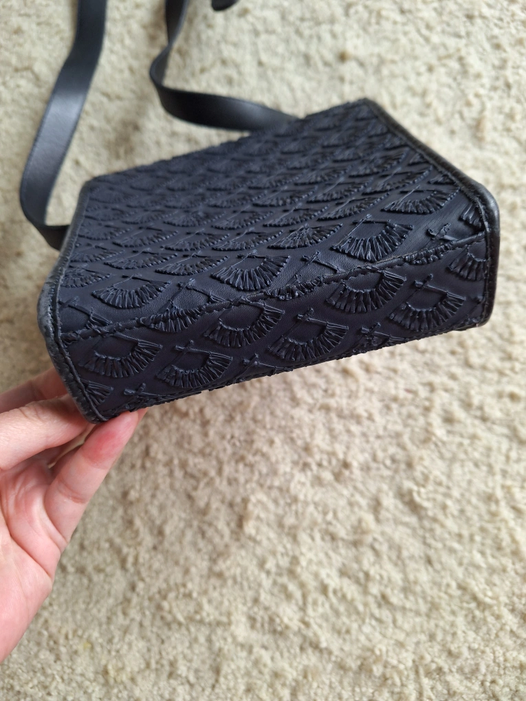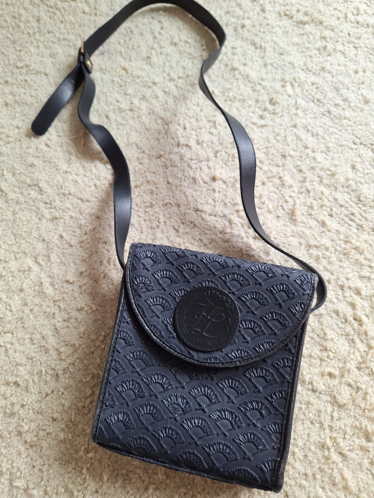Vintage Karl Lagerfeld signature embossed fan design with adjustable strap, can be worn crossbody or on shoulder. Excellent Condition Navy Blue, material is rubber. Made In France. cash only, pick up at Fairview Mall TnT supermarket.