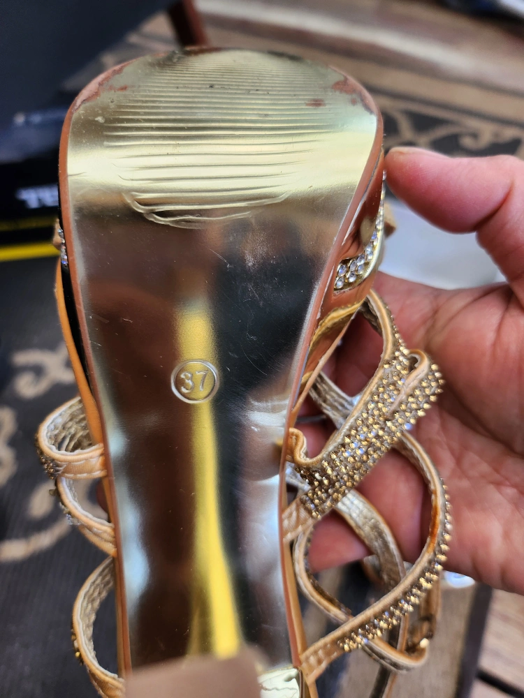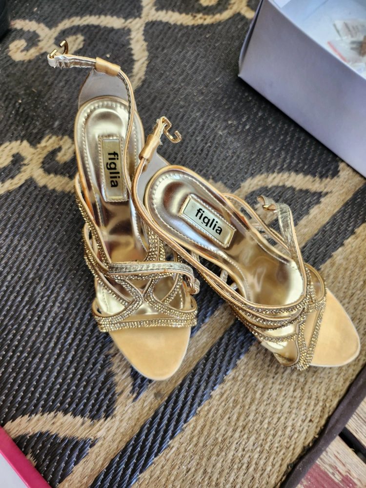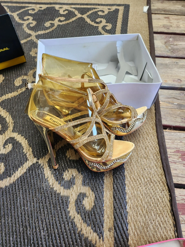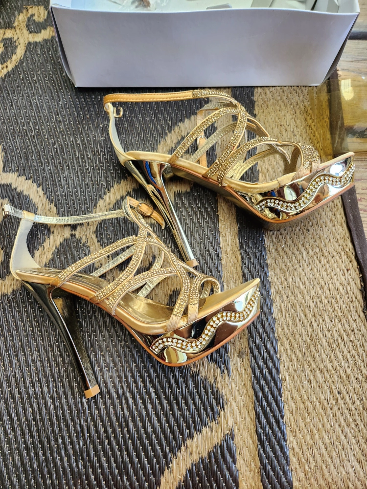 These gold platform sandals are a stunning pair of shoes. They have high heel and intricate straps adorned with rhinestones. just used one time for a special event.