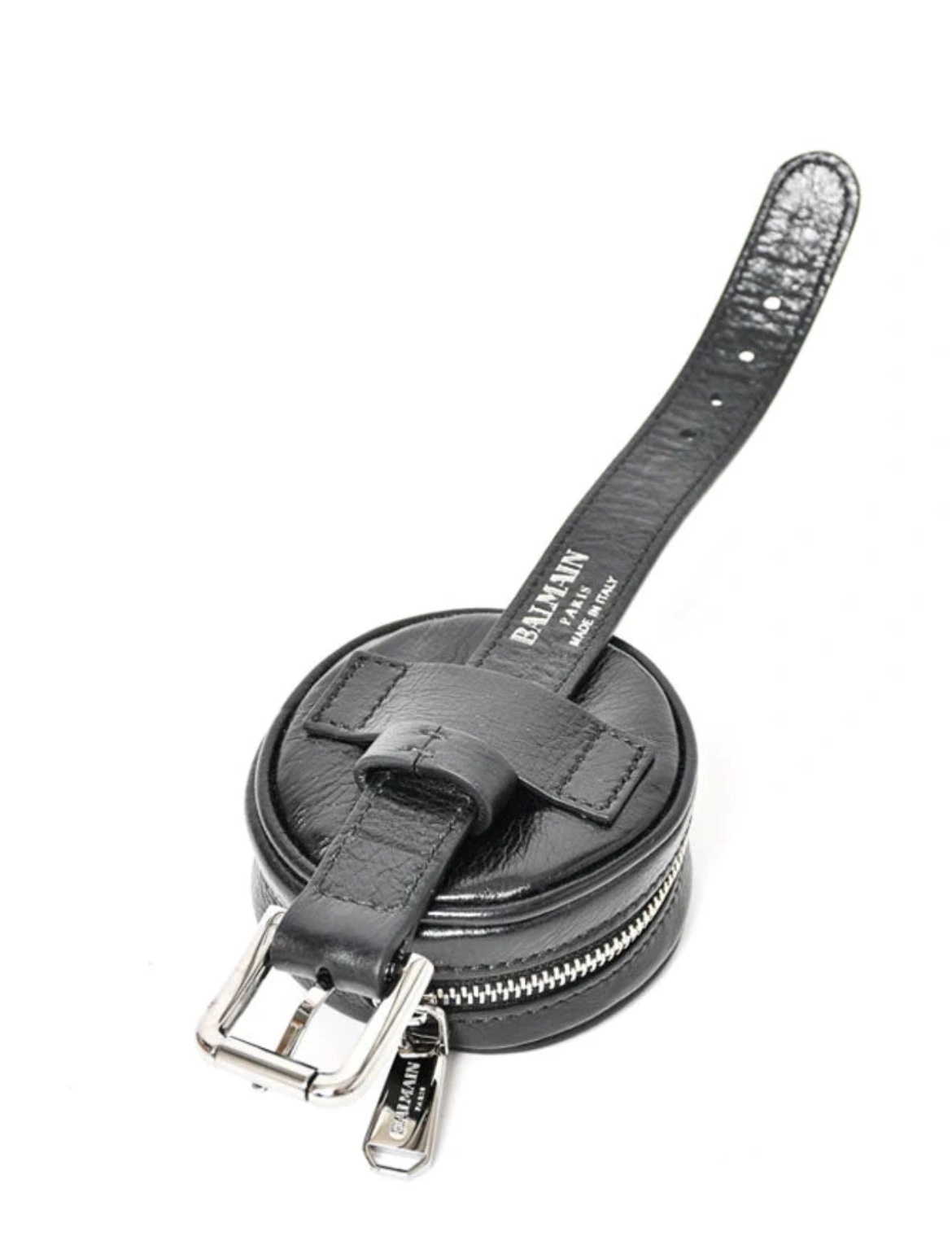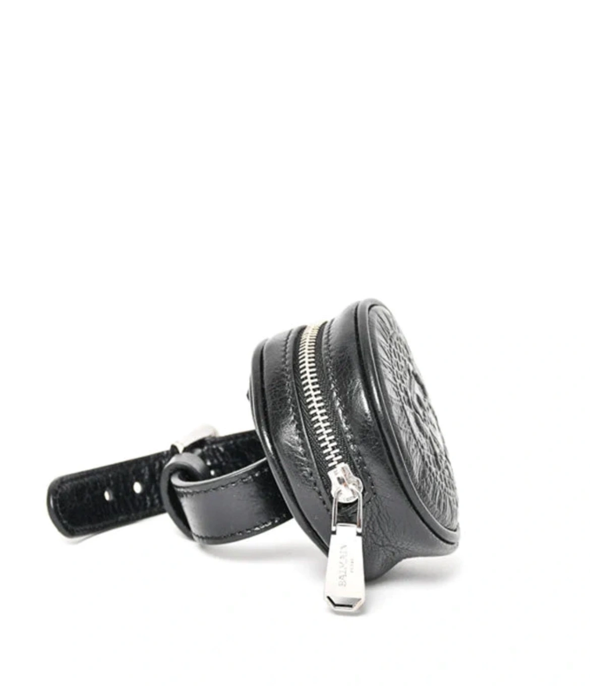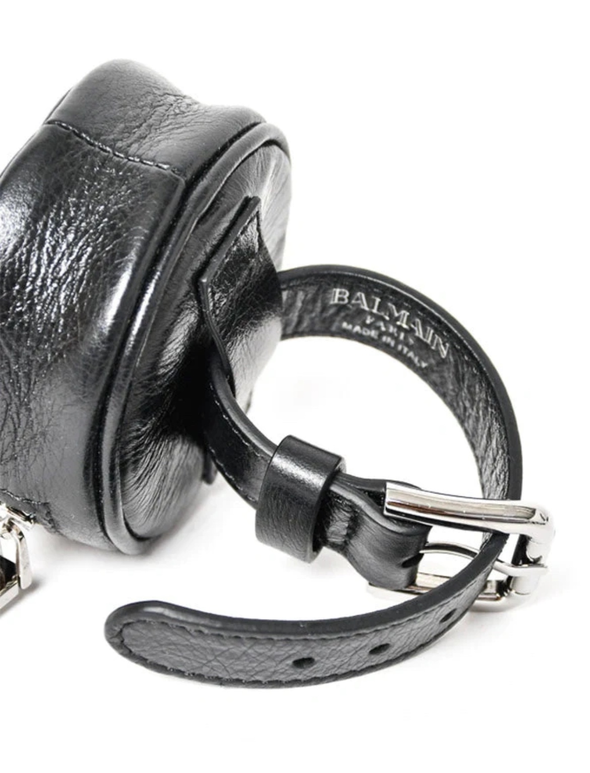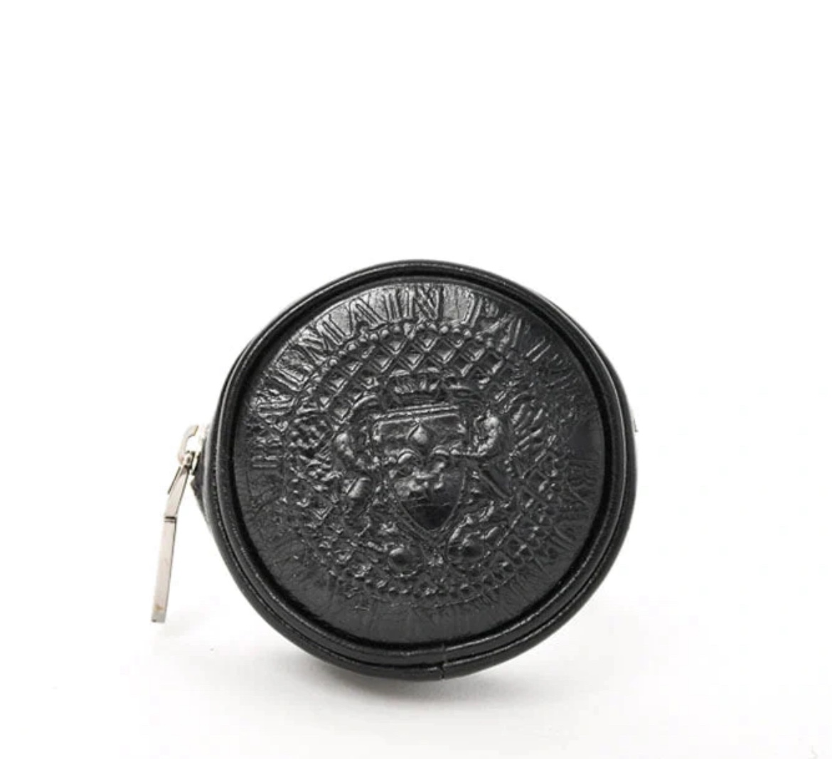 Balmain Black Leather Coin Pouch Wristlet. Top zip closure. Removable wrist strap. Open interior. Silver-tone hardware. Also fits on a belt. 3" length x 1" depth
