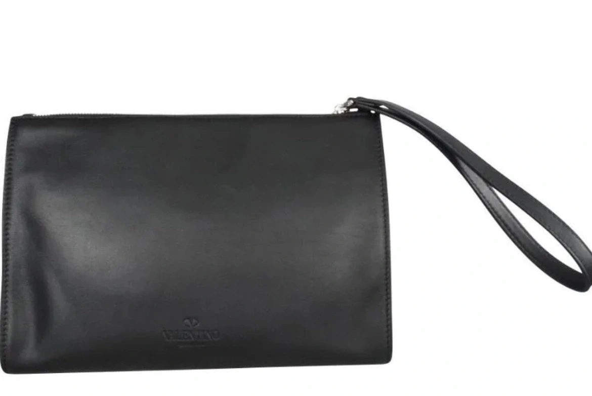 BRAND NEW WITH TAGS Valentino Clutch Black Leather Graphic Print Rockstud Accents Studded Accents Zip Closure at Top Includes Dust Bag MADE IN ITALY