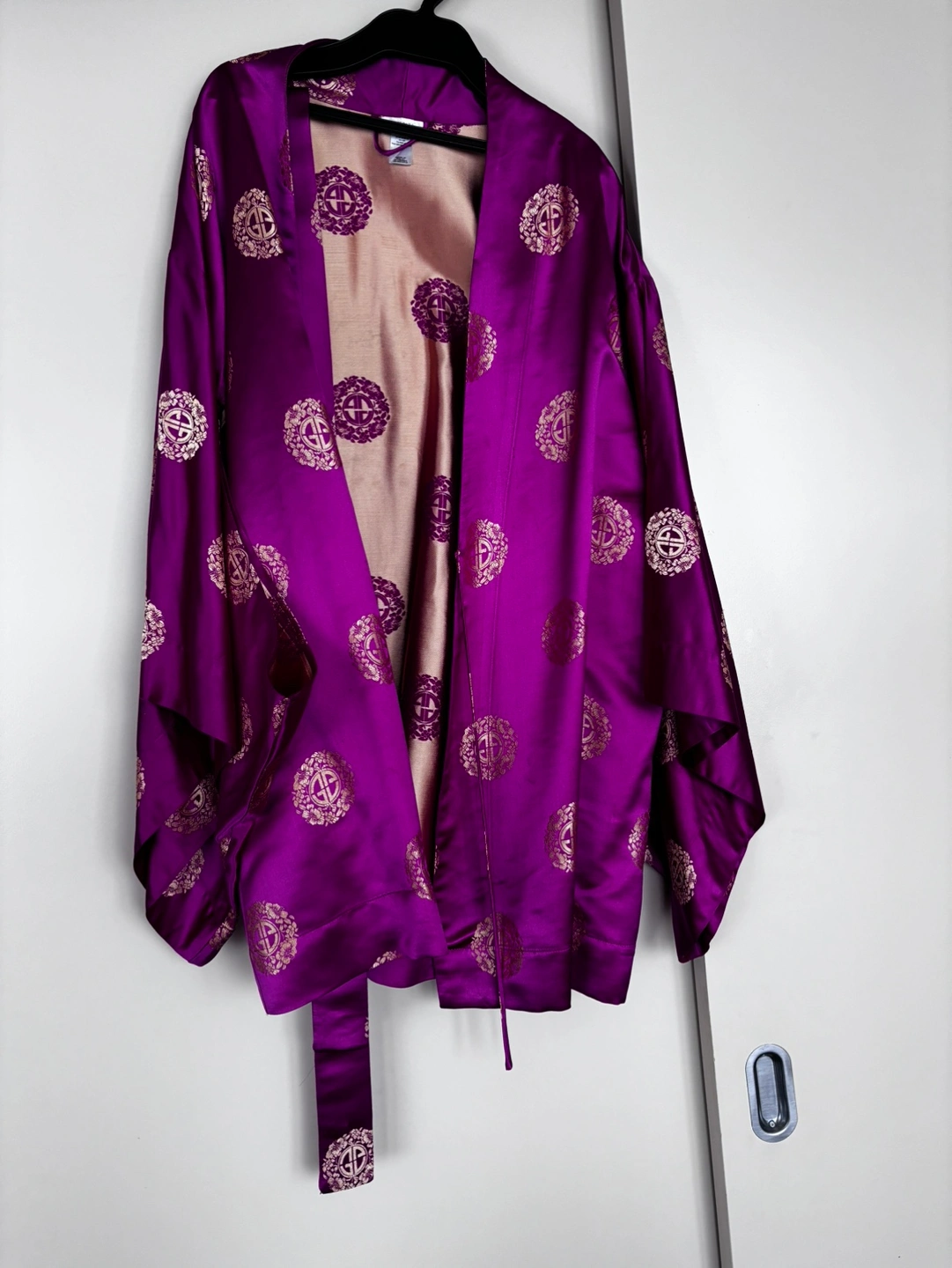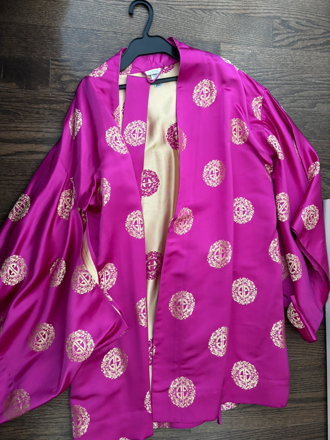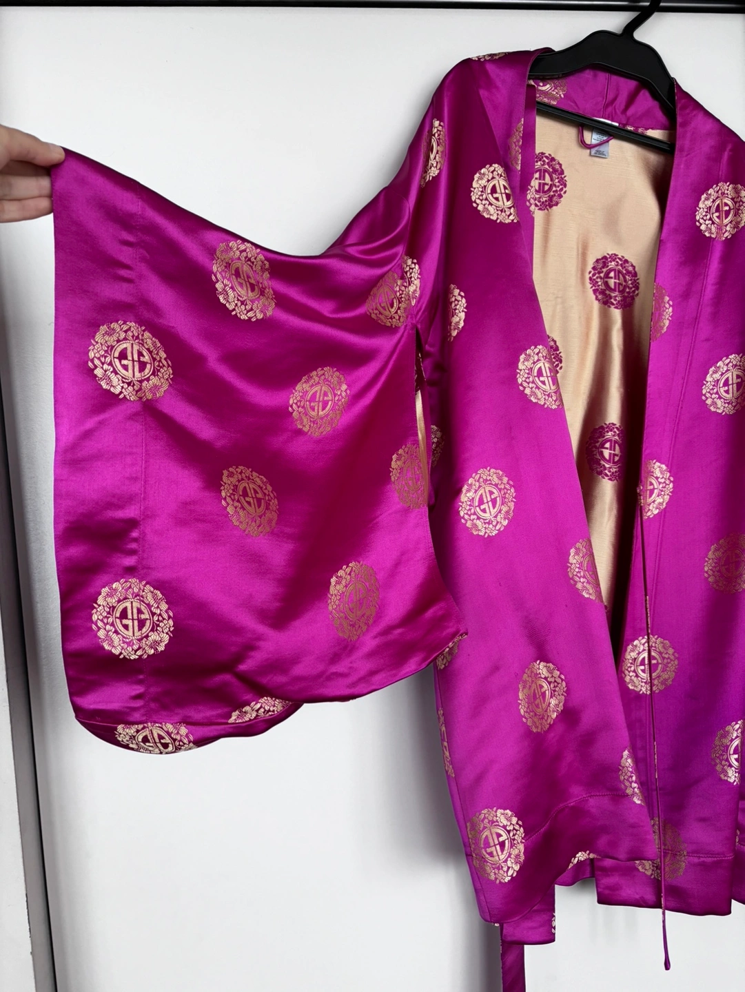 A beautiful vintage short length silk kimono with a fuchsia pink exterior and gold interior. It has long sleeves and a sash and a medium width belt. High quality heavy fabric. Barely worn, gently stored, dry cleaned. See photos for more information.