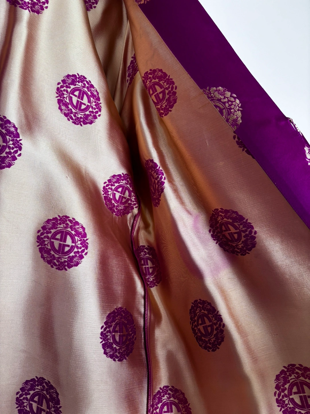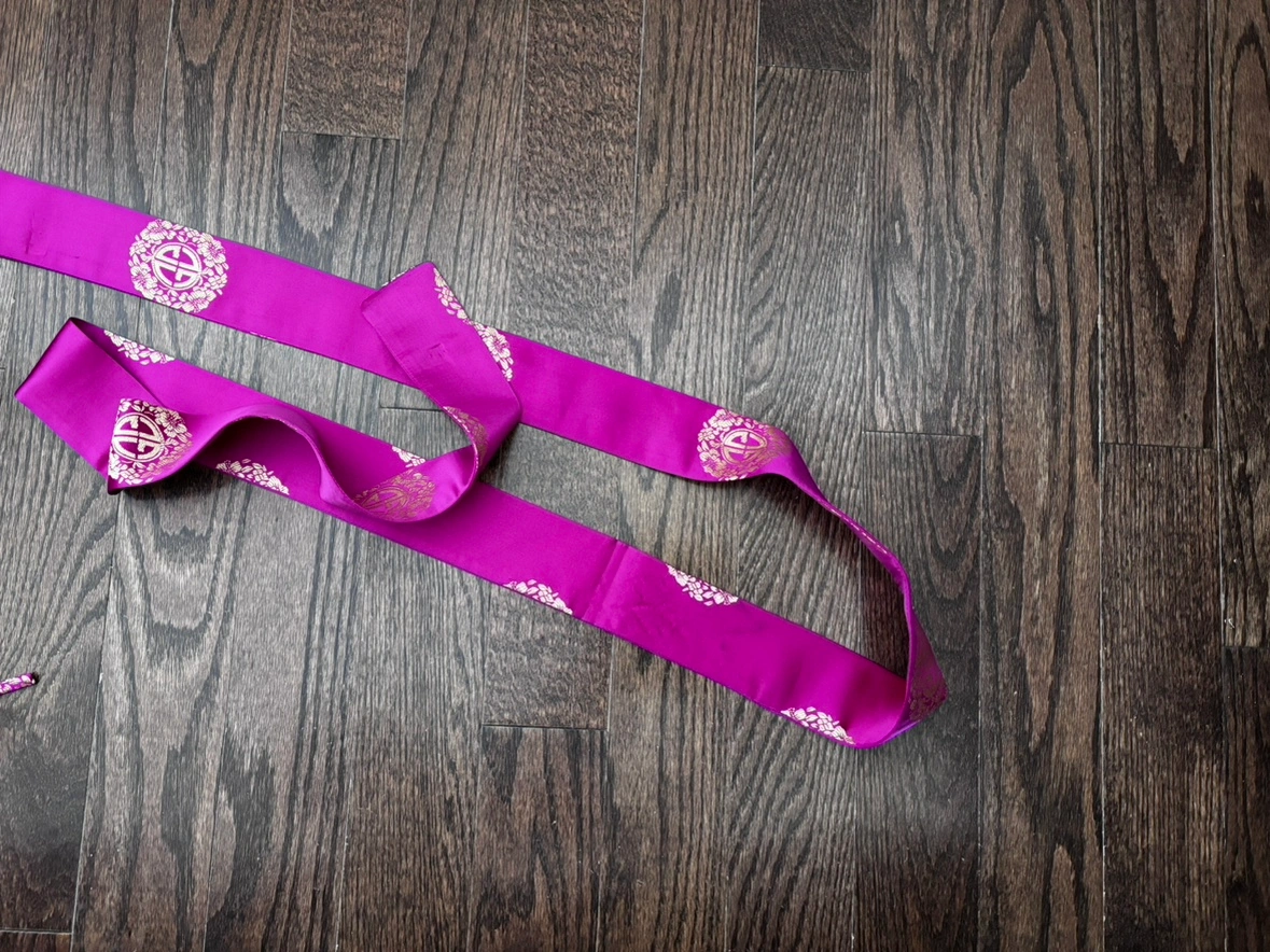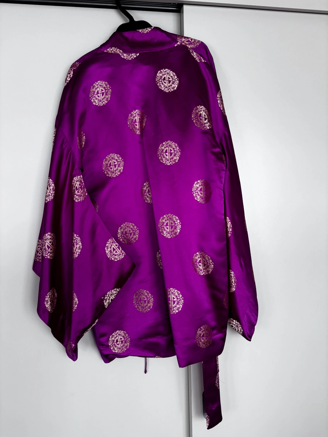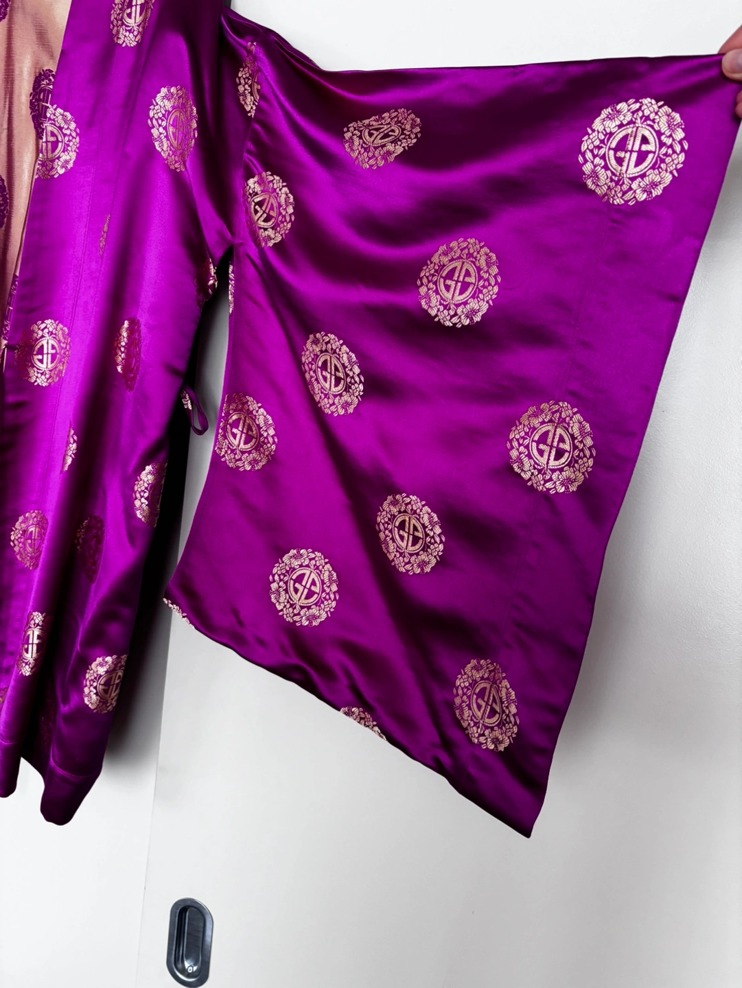 A beautiful vintage short length silk kimono with a fuchsia pink exterior and gold interior. It has long sleeves and a sash and a medium width belt. High quality heavy fabric. Barely worn, gently stored, dry cleaned. See photos for more information.