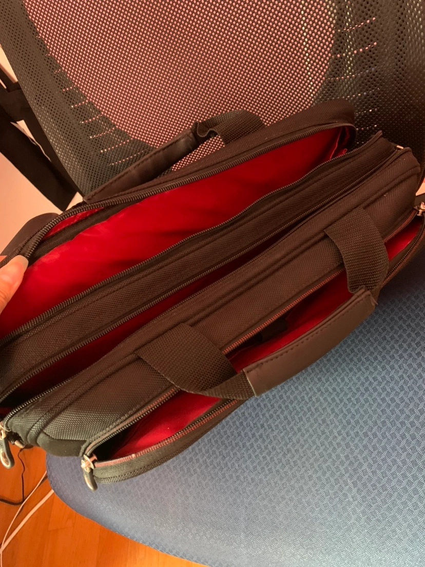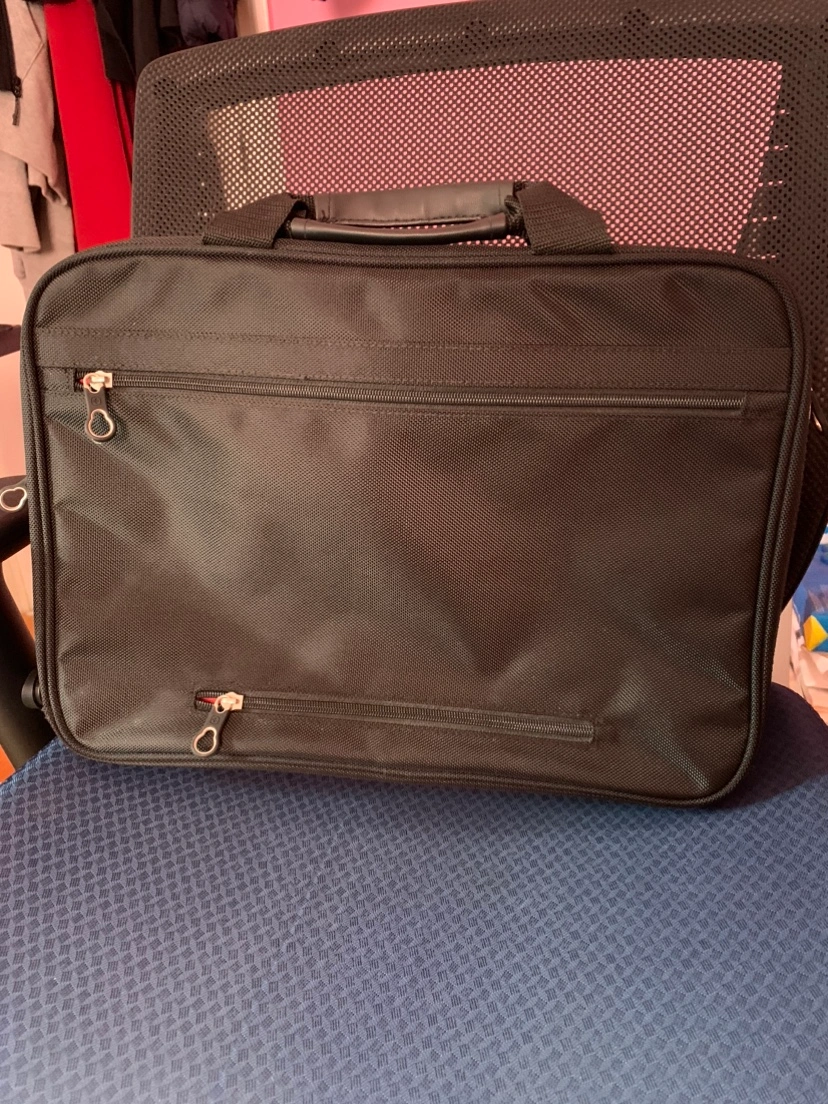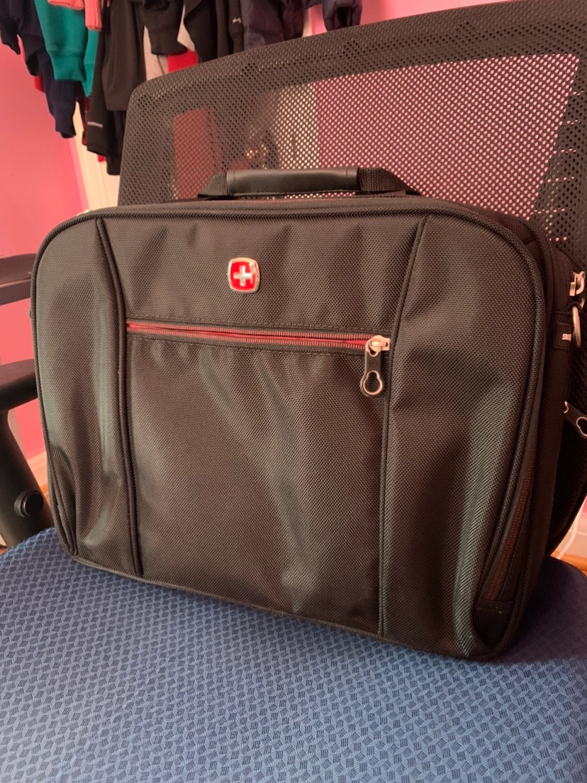 Black laptop bag with a red interior and SwissGear logo. Used only a few times. Bought it for 66+tax. Doesn’t come with a strap because it didn’t come with it…and I realized too late. Can store a 15.6’’ laptop.