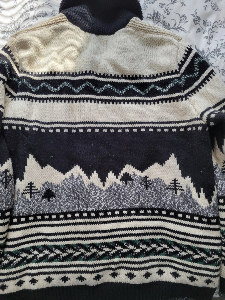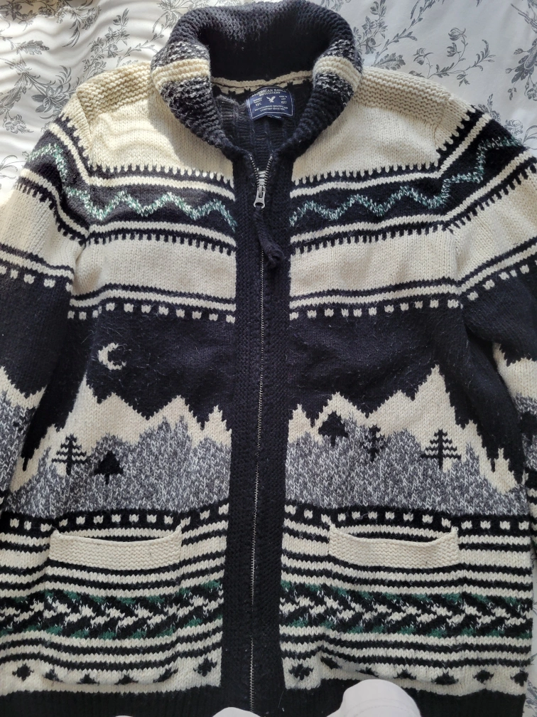 Men's large American Eagle full zip sweater. Black and white design. Great for fall/winter weather.