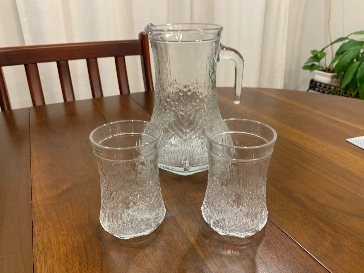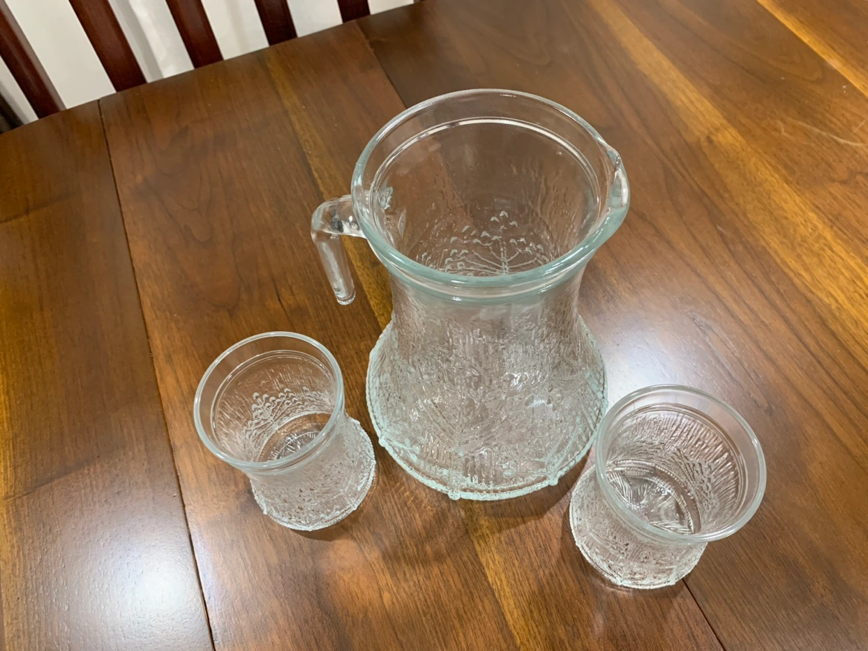 This fine crystal pitcher and matching glasses were designed by Pertti Kallioinen (Koiranputki Pattern) in the mid 1970's and manufactured by Lasisepat, Mantsala in Finland. Production was later continued by Dansk, (called Floriform pattern) and the word "Italy" was stamped on those pieces. Textured on underside, smooth on upper surface. Perfect for lemonade, margaritas, mimosas or orange juice. It would also make a lovely vase, All piece are in excellent condition, the pitcher measures 8 & 1/2” tall, 6 & 1/4” across the base, 4 & 1/8” across the mouth and holds six cups. The glasses measure 4 & 3/4” tall and 3” across. Pickup in Thornhill near Yonge Street and Royal Orchard Blvd. If you like this item, view my other listings for more vintage and unique finds.
