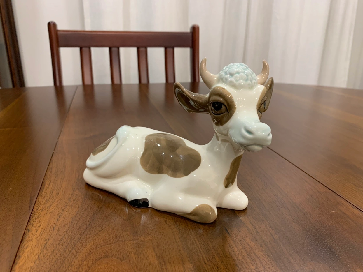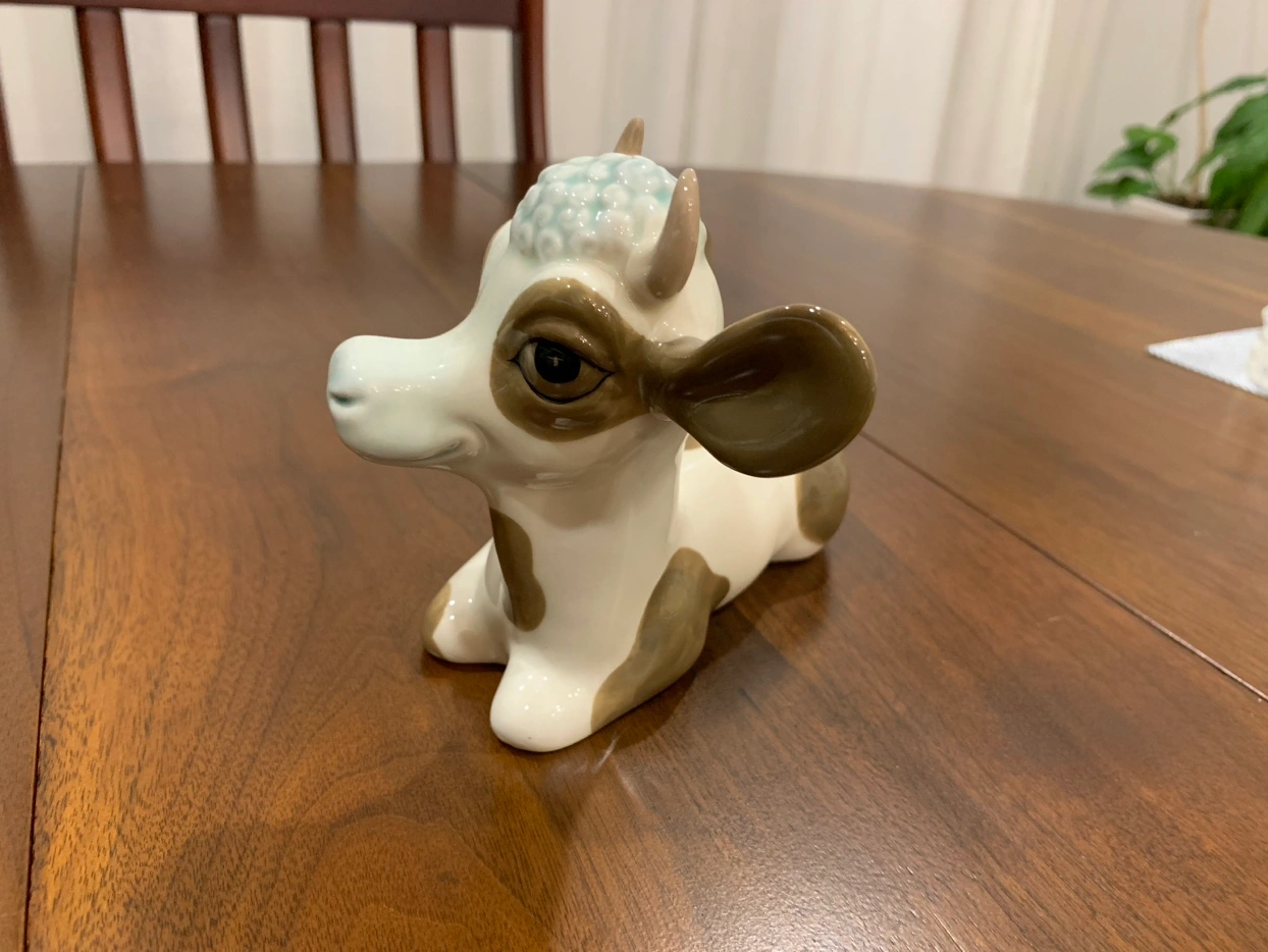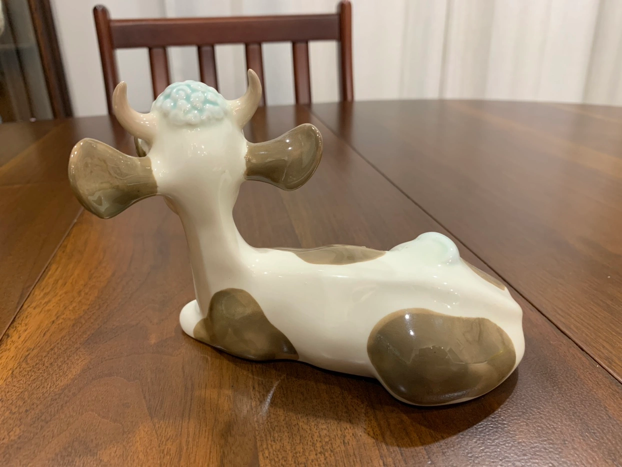 A vintage ceramic cow by Szeiler Studio in England. In perfect condition, no repairs, cracks or chips. This sweet lady is white with brown spots and big horns. She has wide eyes and is decorated with a sweet grey blue nose and hair tuff. She was hand painted on ceramic in the 1970’s. She measures 5” tall, 7” wide and 3 & 1/4” deep. She is stamped Szeiler Studio England underneath. Pick up in Thornhill near Yonge Street and Royal Orchard Boulevard. A great gift for a cow aficionado. If you like, this item view my other listings for more vintage and unique finds.