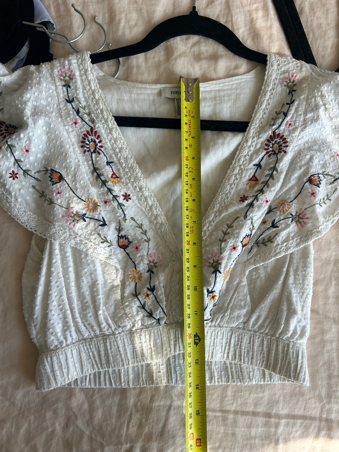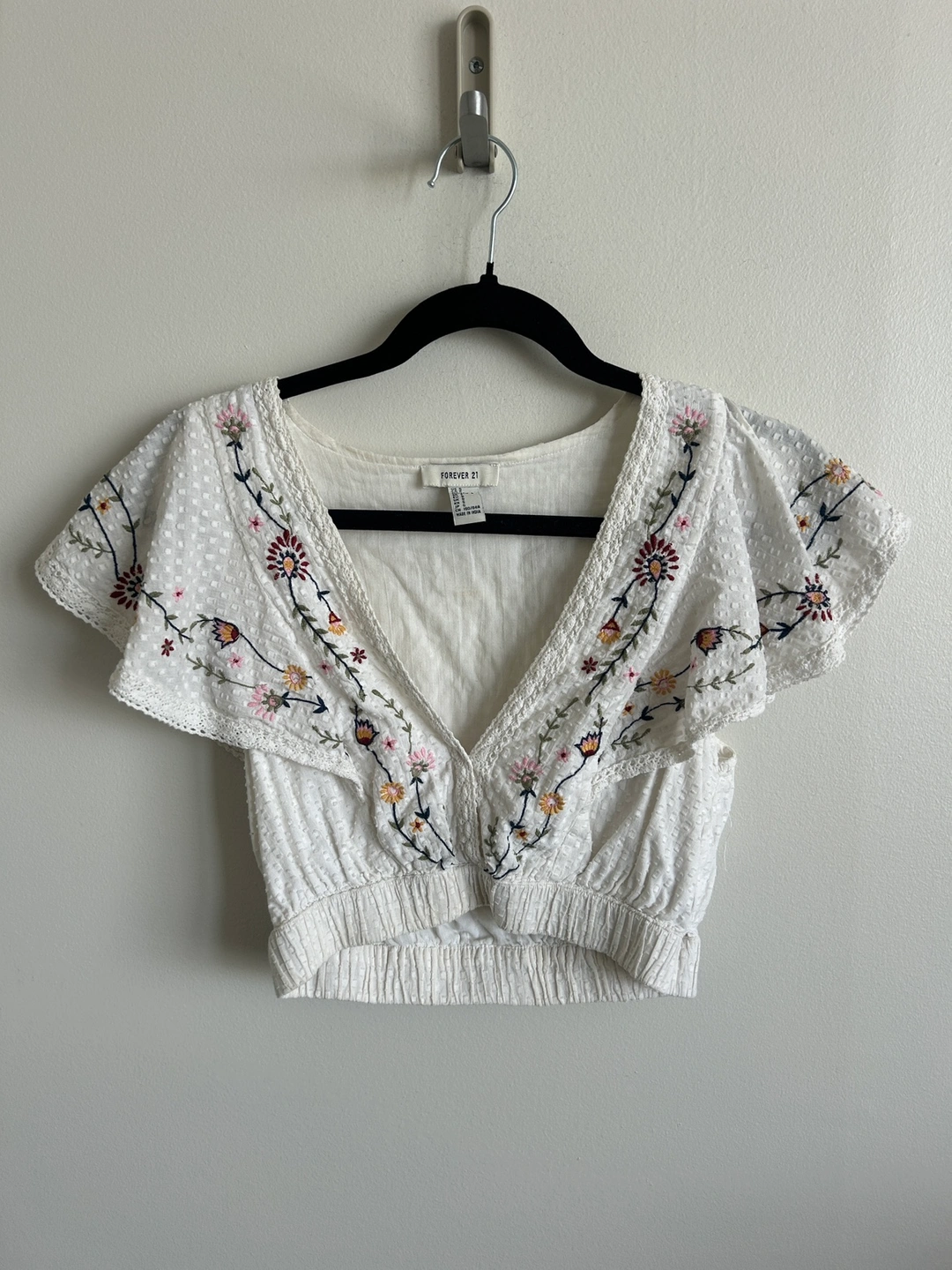 White crop top with floral embroidery and lace trim. It features a V-neckline and short sleeves. The top is made from a lightweight fabric that is perfect for the summer.