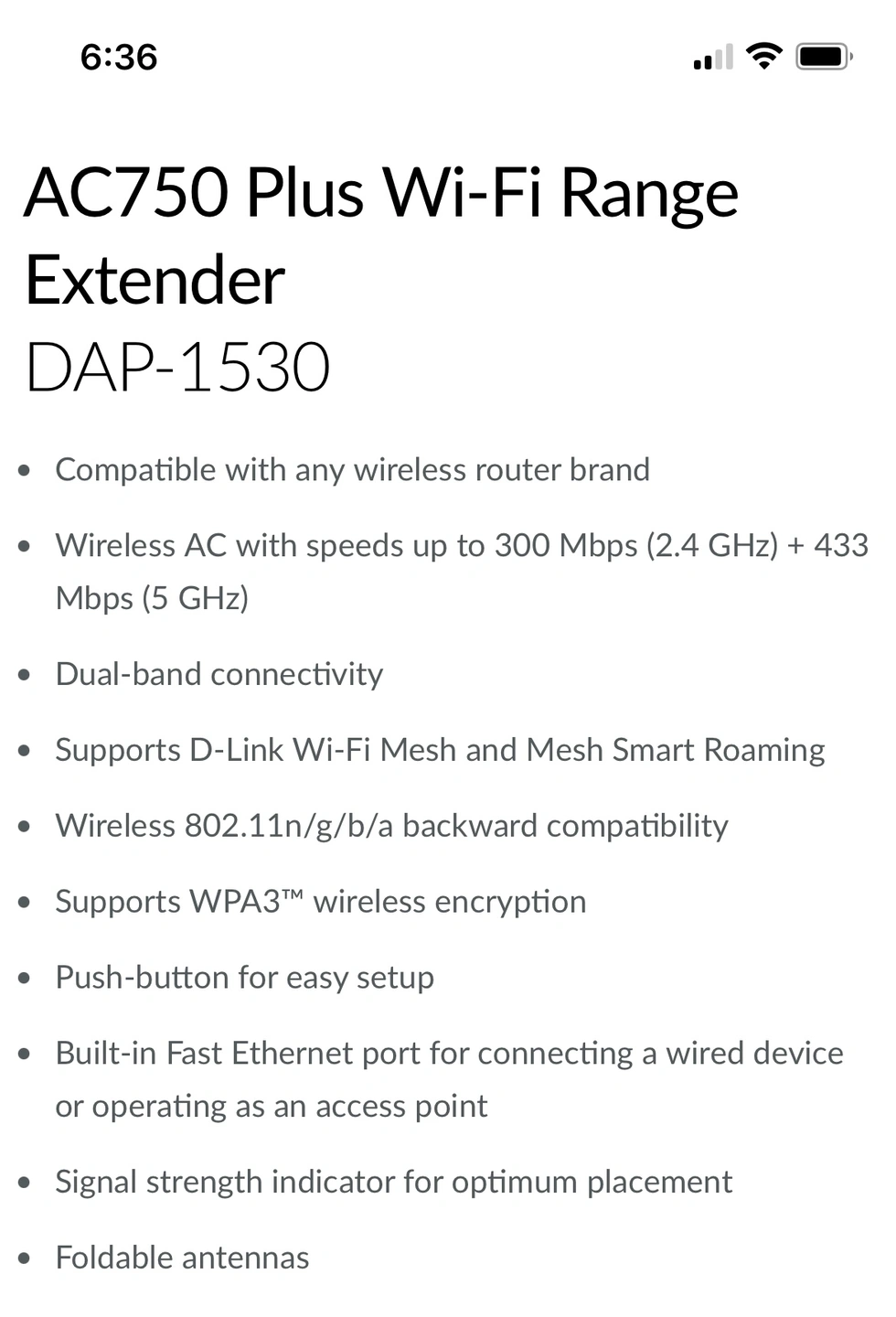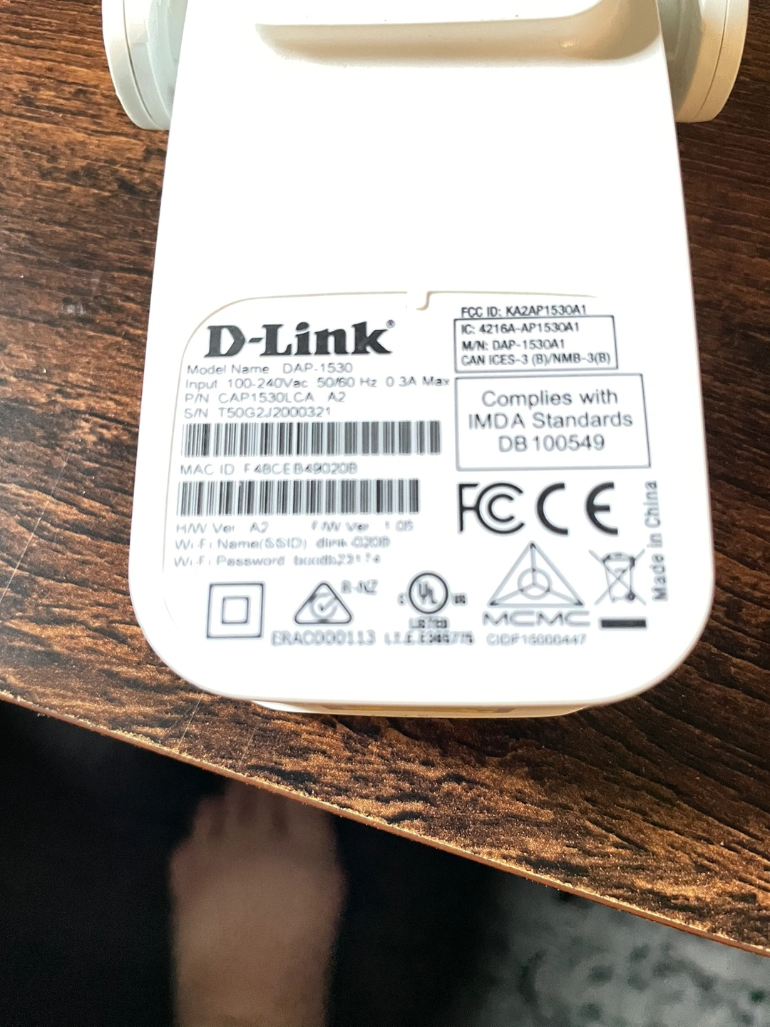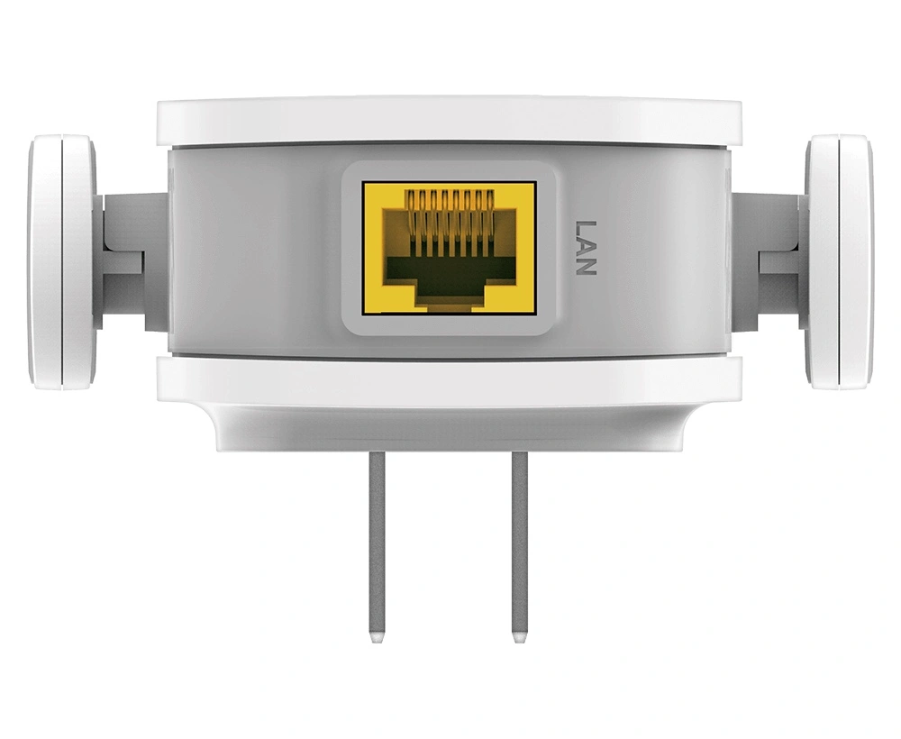 A D-Link Wi-Fi range extender, with two antennas, a built-in power plug, and an ethernet port. Works wirelessly, or via direct ethernet cable.