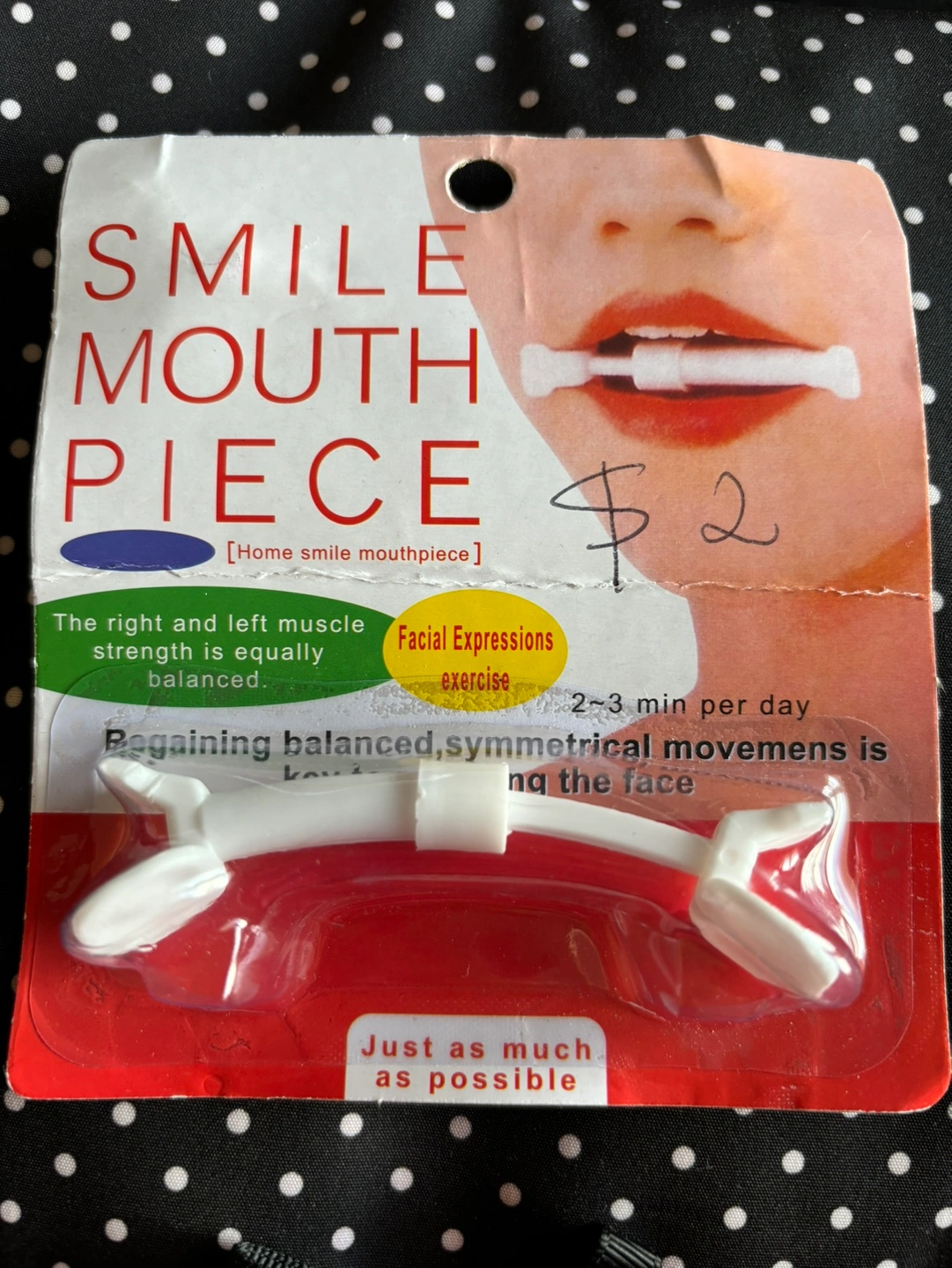 A white mouth piece that helps with facial exercises to boost collagen and reduce laughing lines or wrinkles. Helps in regaining balanced, symmetrical movements. Use 2-3 minutes per day.