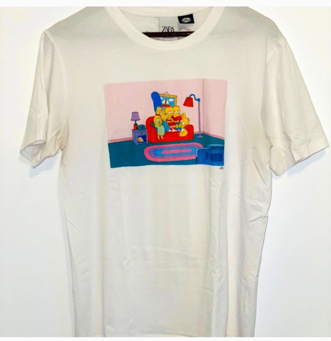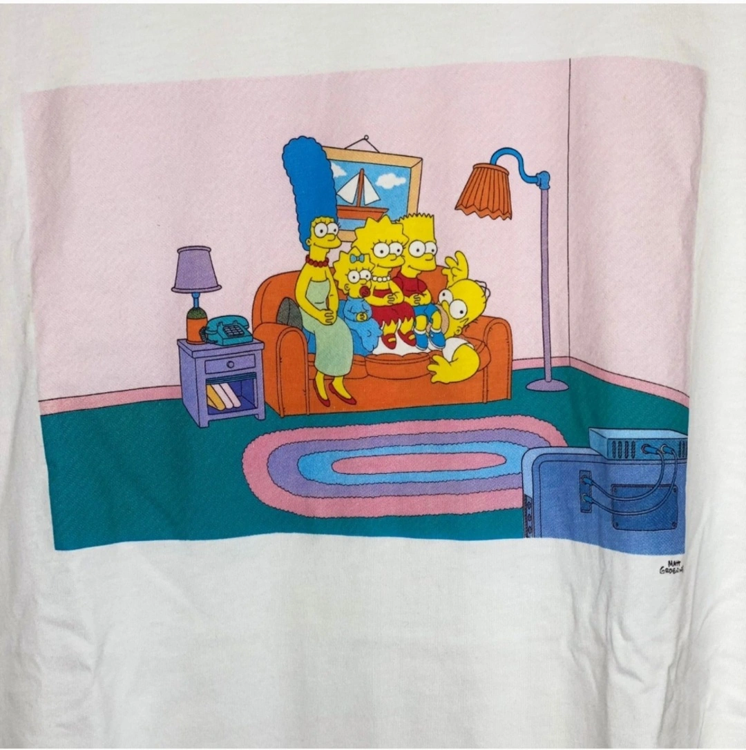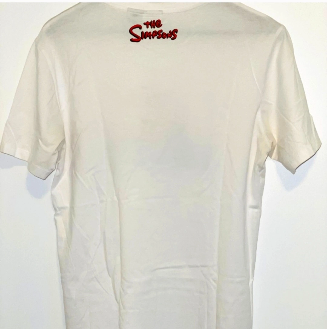 White t-shirt with a graphic image of The Simpsons family on the front. The back of the shirt has "The Simpsons" printed on it.