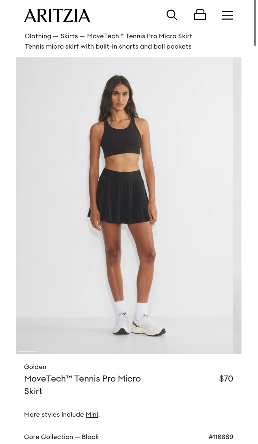 Black Aritzia MoveTech Tennis Pro Micro Skirt. Size Small. Comes with built-in shorts and ball pockets. Brand new, never worn Super stretchy fabric and comes with pockets Selling because I got it as a gift but already have one