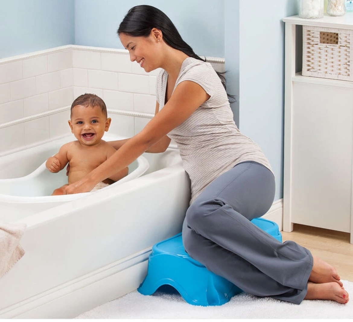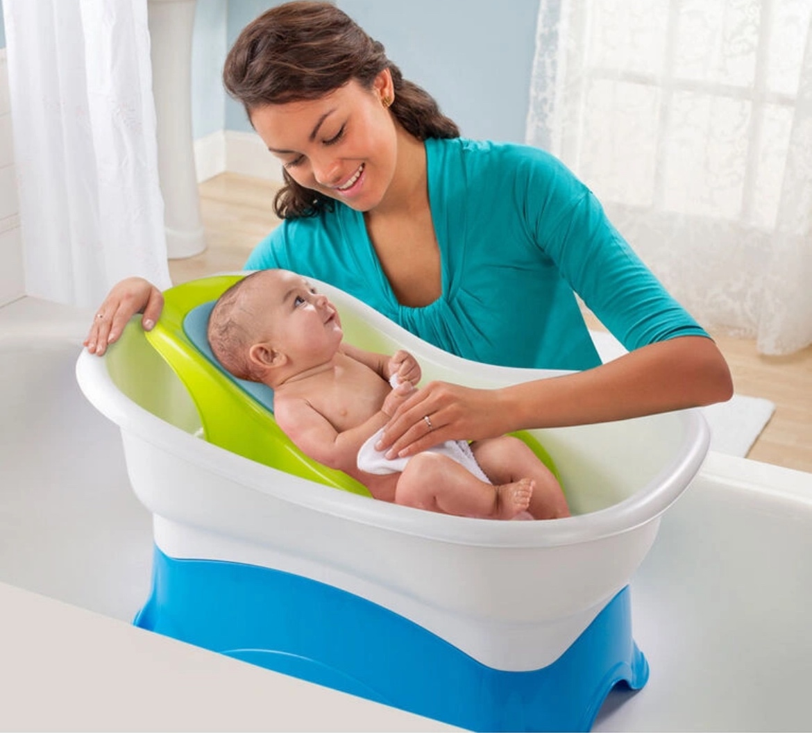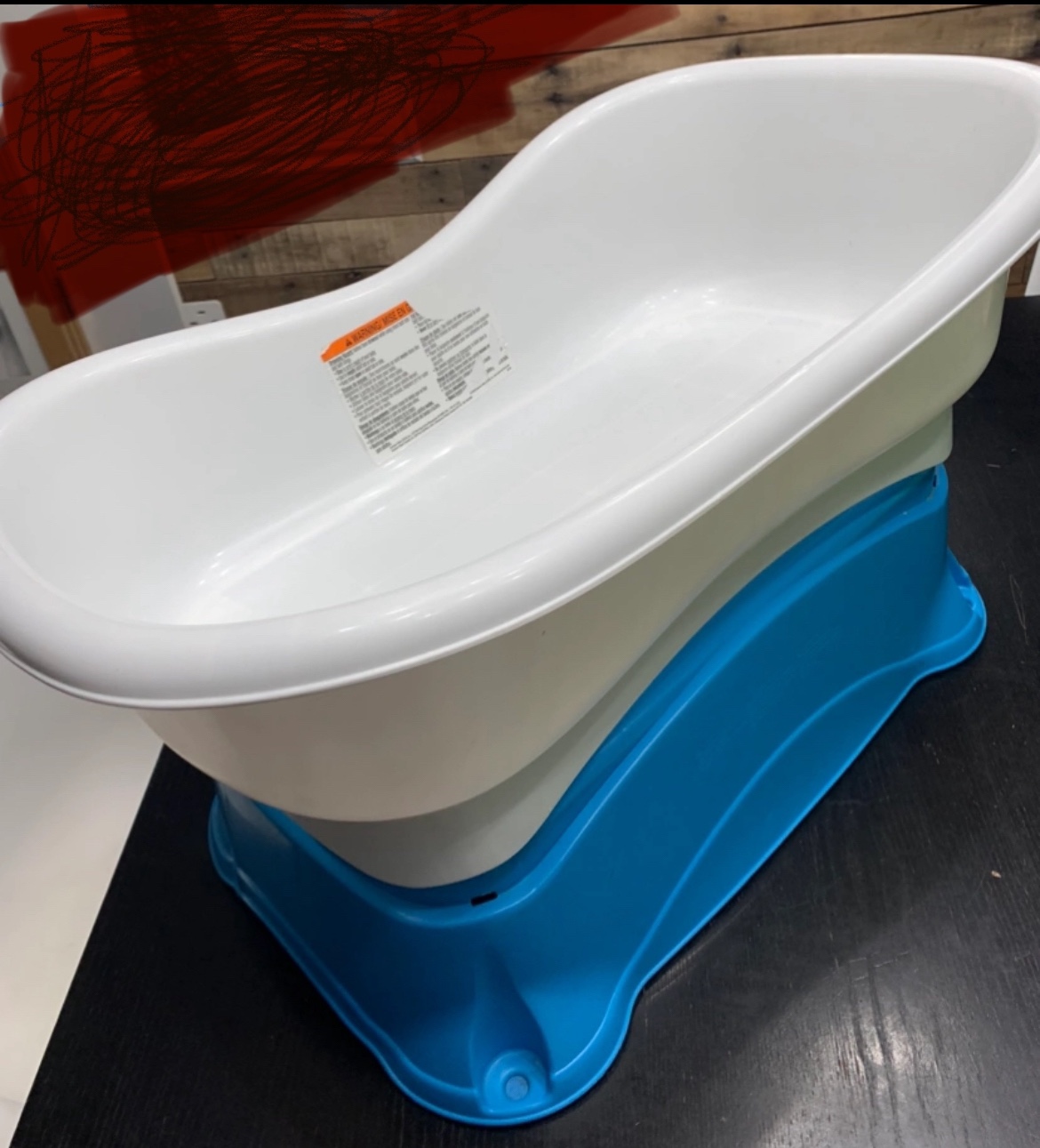 This is a baby bath tub with a stand. It is great for giving your little one a bath, and it's also easy to clean. It is blue and white.