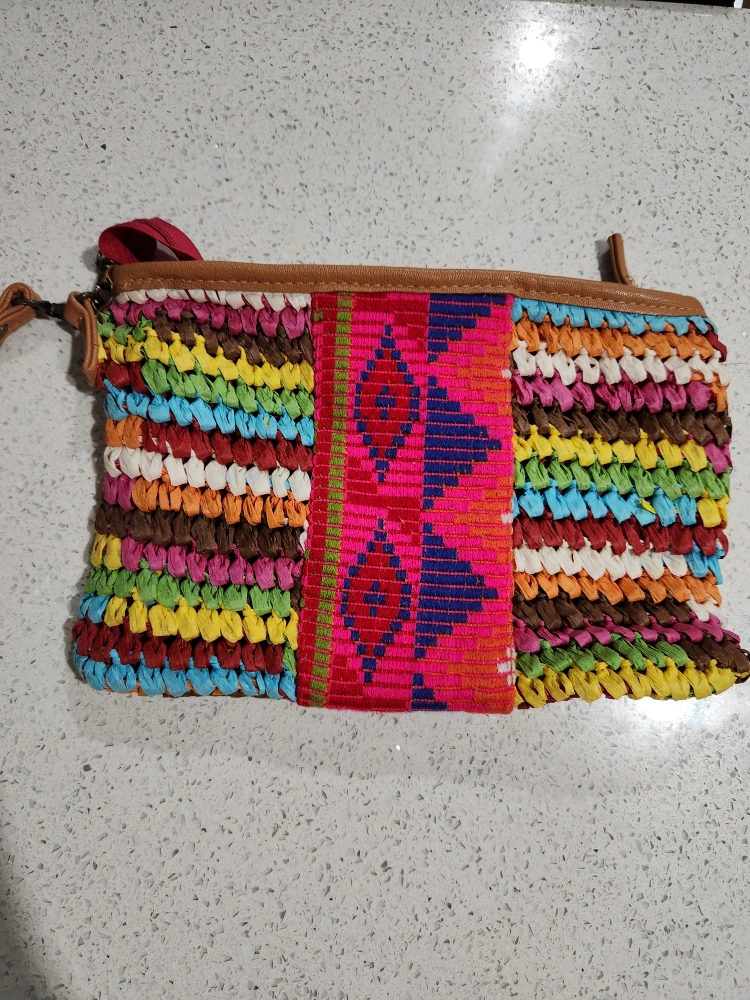 A bright and colourful woven clutch with a leather strap and a zipper closure. This clutch is perfect for adding a touch of fun to any outfit.