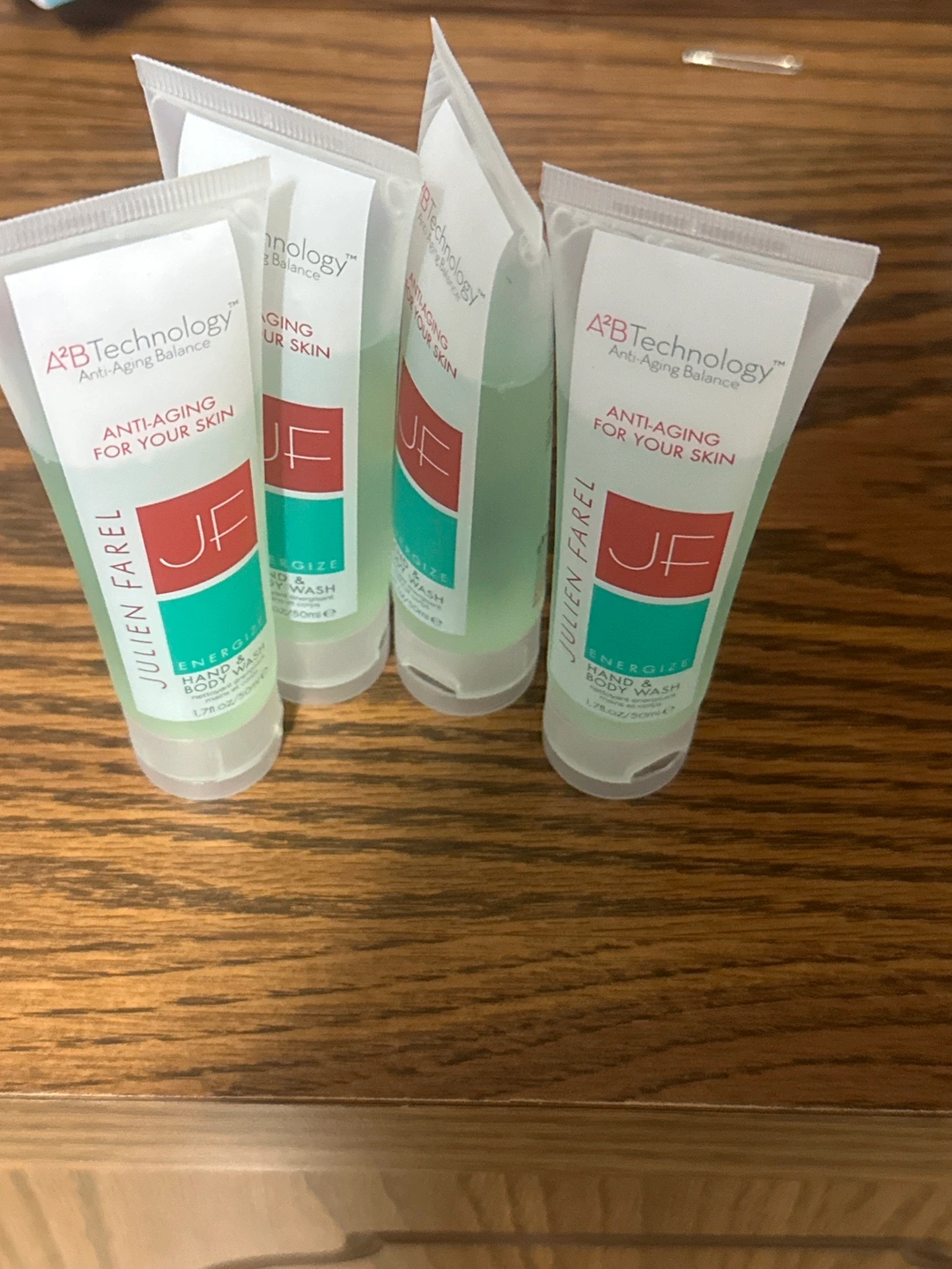 •Set of four travel-sized tubes of Julien Farel Hand and Body Wash. • Never used • 50ml each • Anti-aging balance & A2B technology • Good Fragrance Each for $5