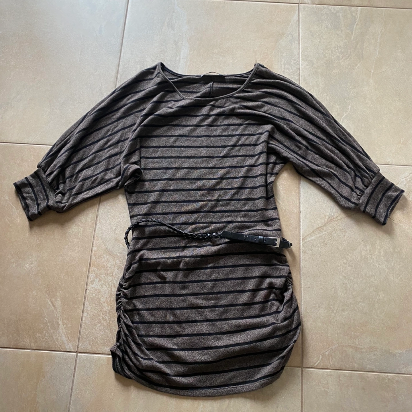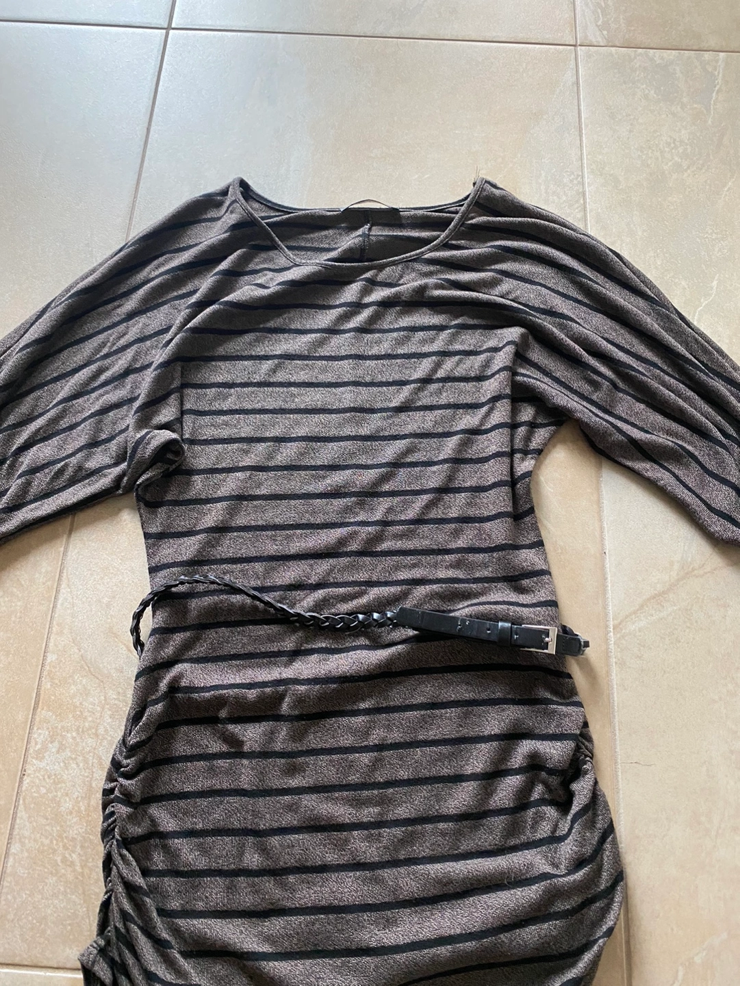 Brown and black 3/4 sleeve striped top with a matching black belt.