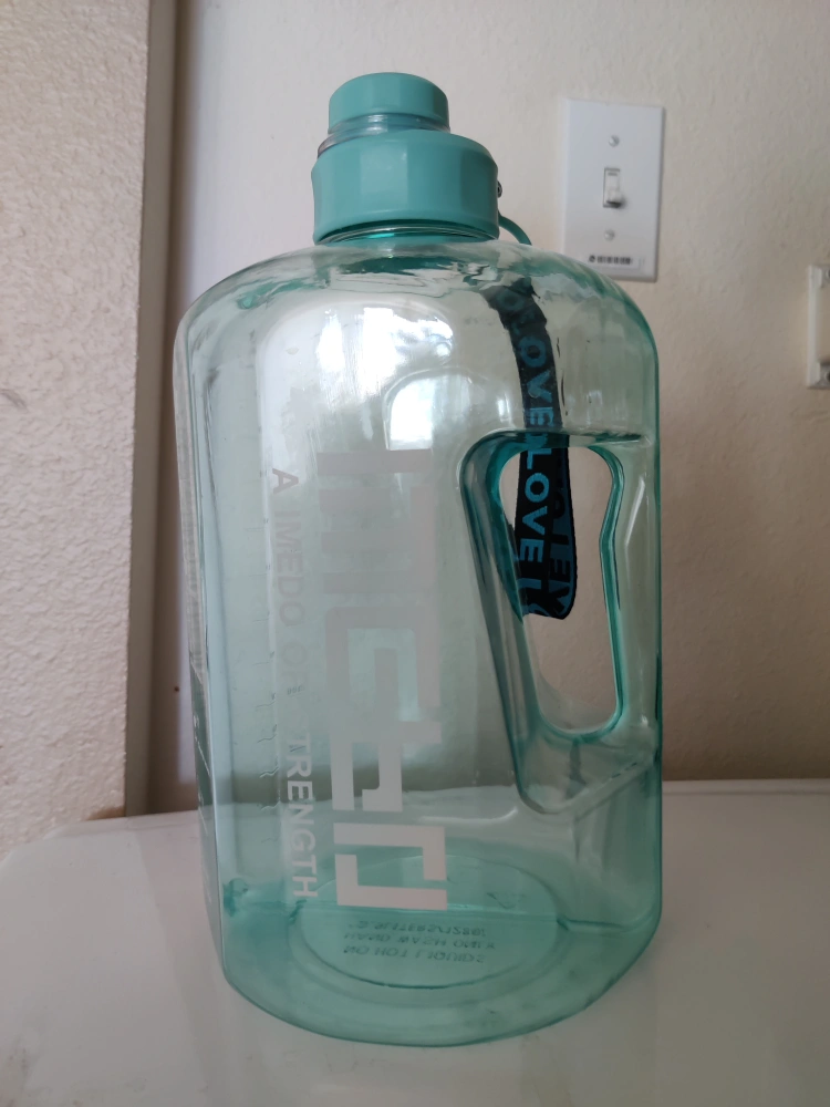 Large water bottle with motivational quotes. Includes a carrying strap and handle. Nice color!