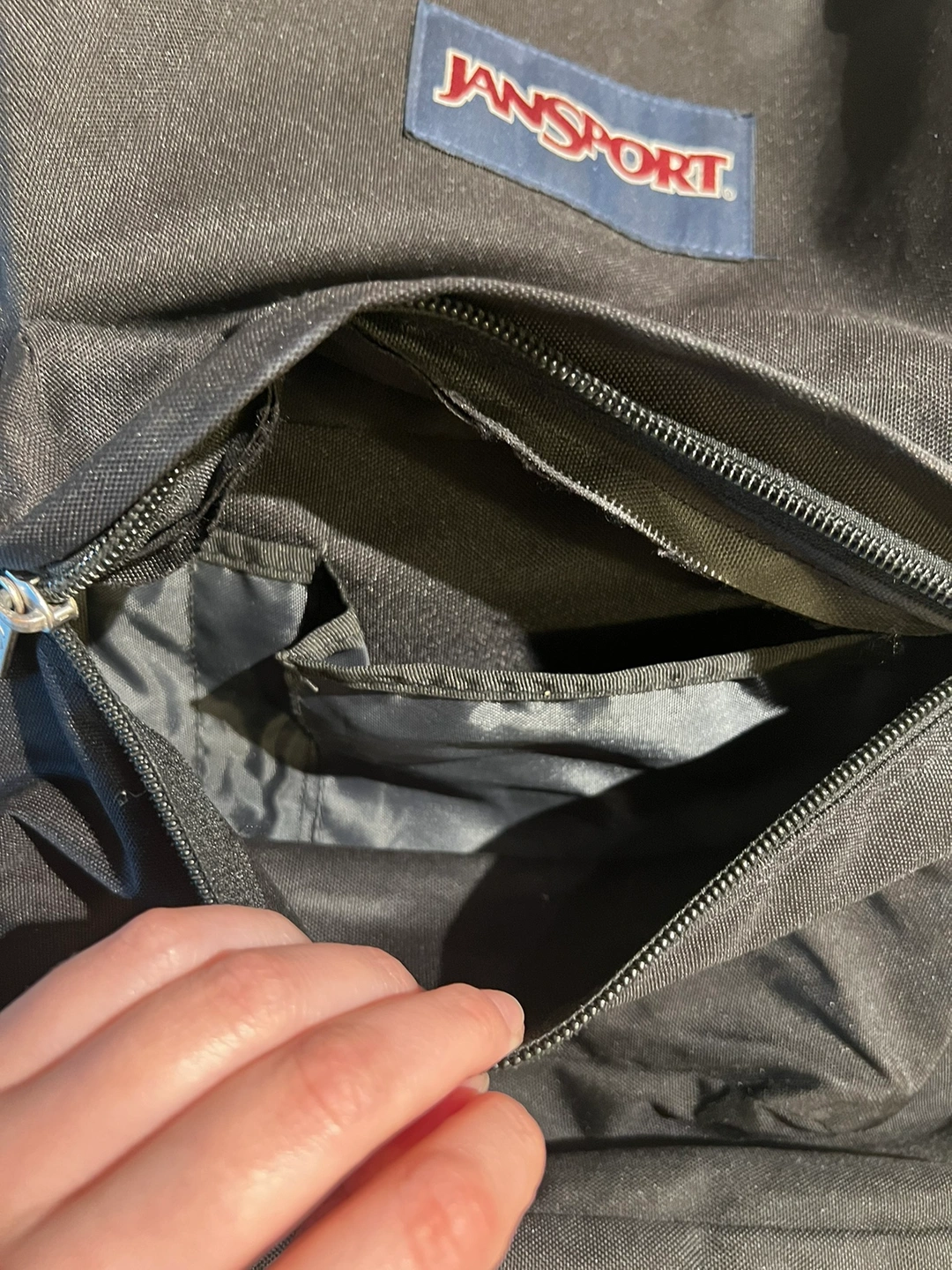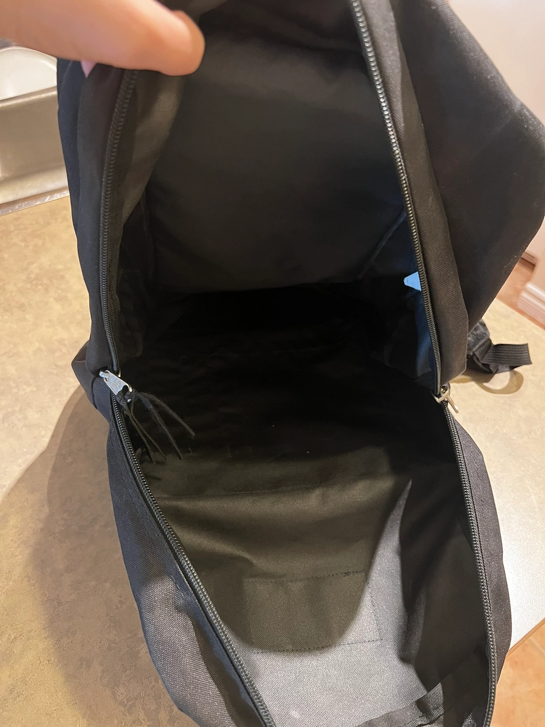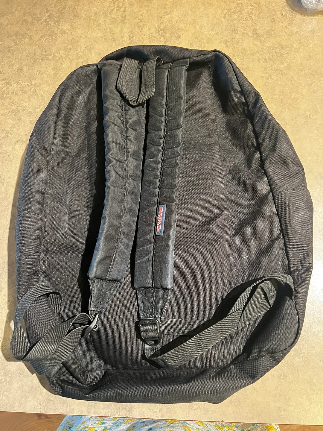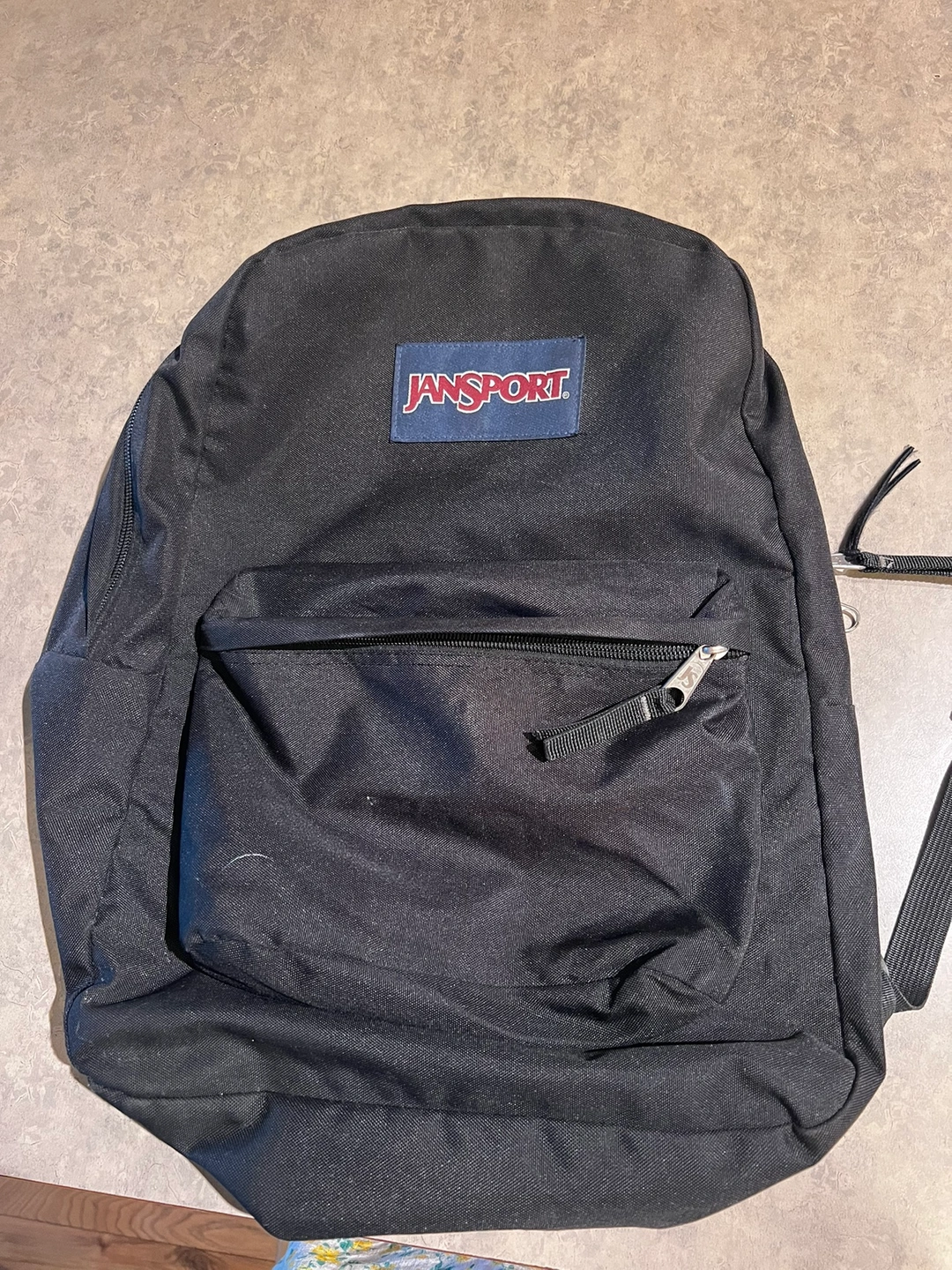 Black Jansport backpack with a zippered front pocket. The backpack has a large main compartment and a zippered pocket inside the main compartment. There is also a zippered pocket on the front of the backpack. The backpack has adjustable straps. It is in good condition. If the ad is still up the product is still available