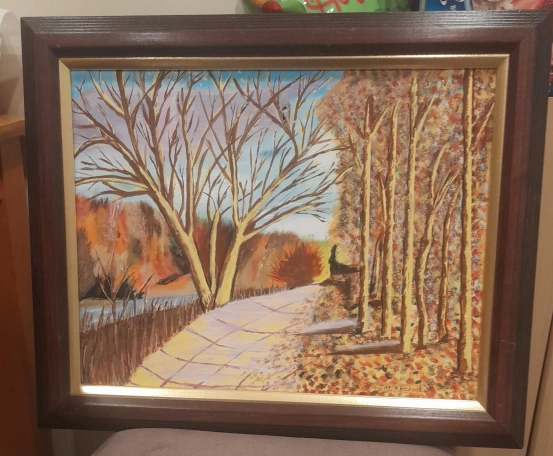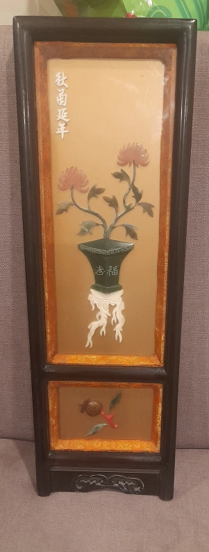 This wall hanging features a jade carving of flowers in a vase, with a smaller jade carving of a small plant in the bottom section. The frame has a wooden exterior with an orange-coloured interior. The wall hanging has characters in Chinese on it. The wall hanging measures approximately 28cm in height and 14cm in width. Each for $5 #ADC🌿