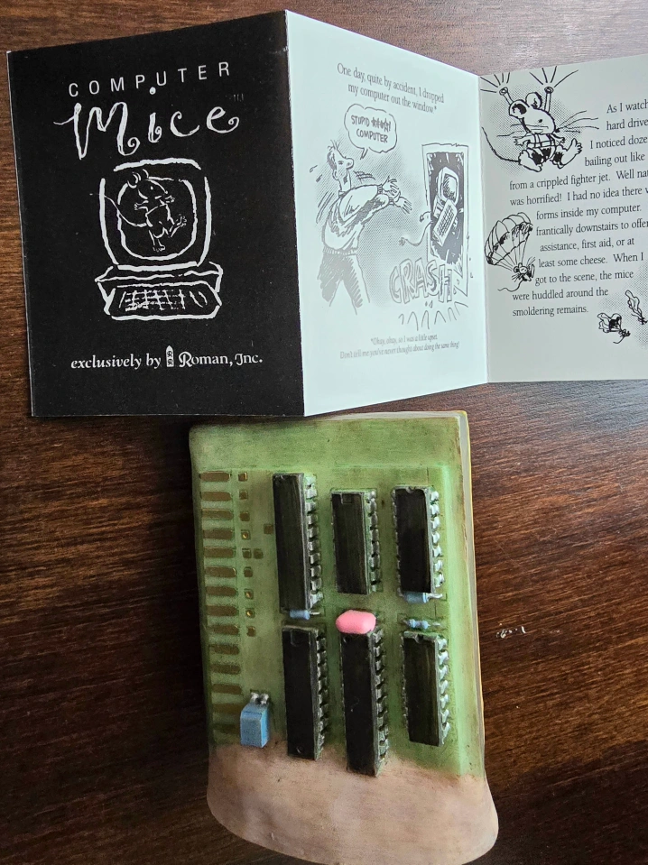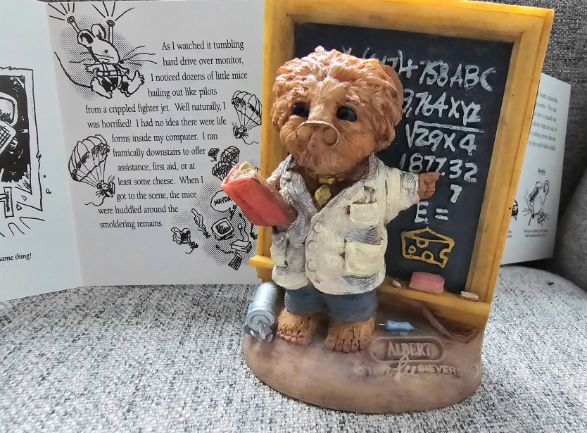 This figurine is a small-sized, painted and glazed ceramic figurine of a professor-like bear holding a book and standing near a chalkboard.