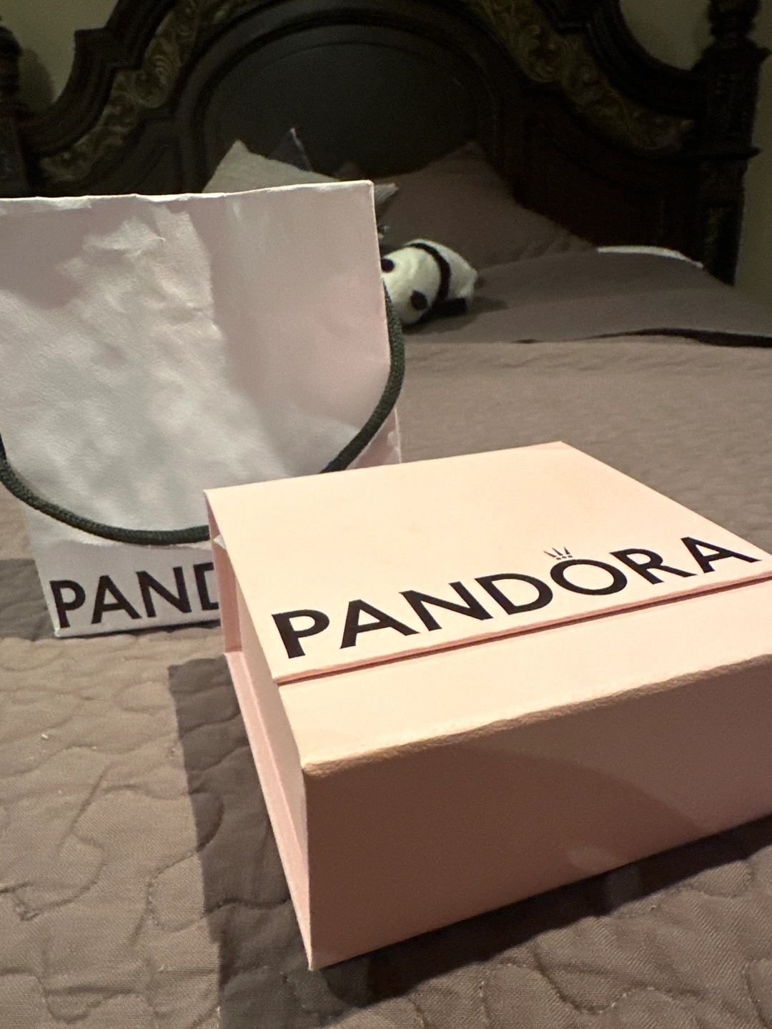 This is a beautiful pink Pandora jewellery box. The box is in excellent condition and includes tissue paper. The box is perfect for storing your Pandora jewellery. It comes with a gift bag as well !