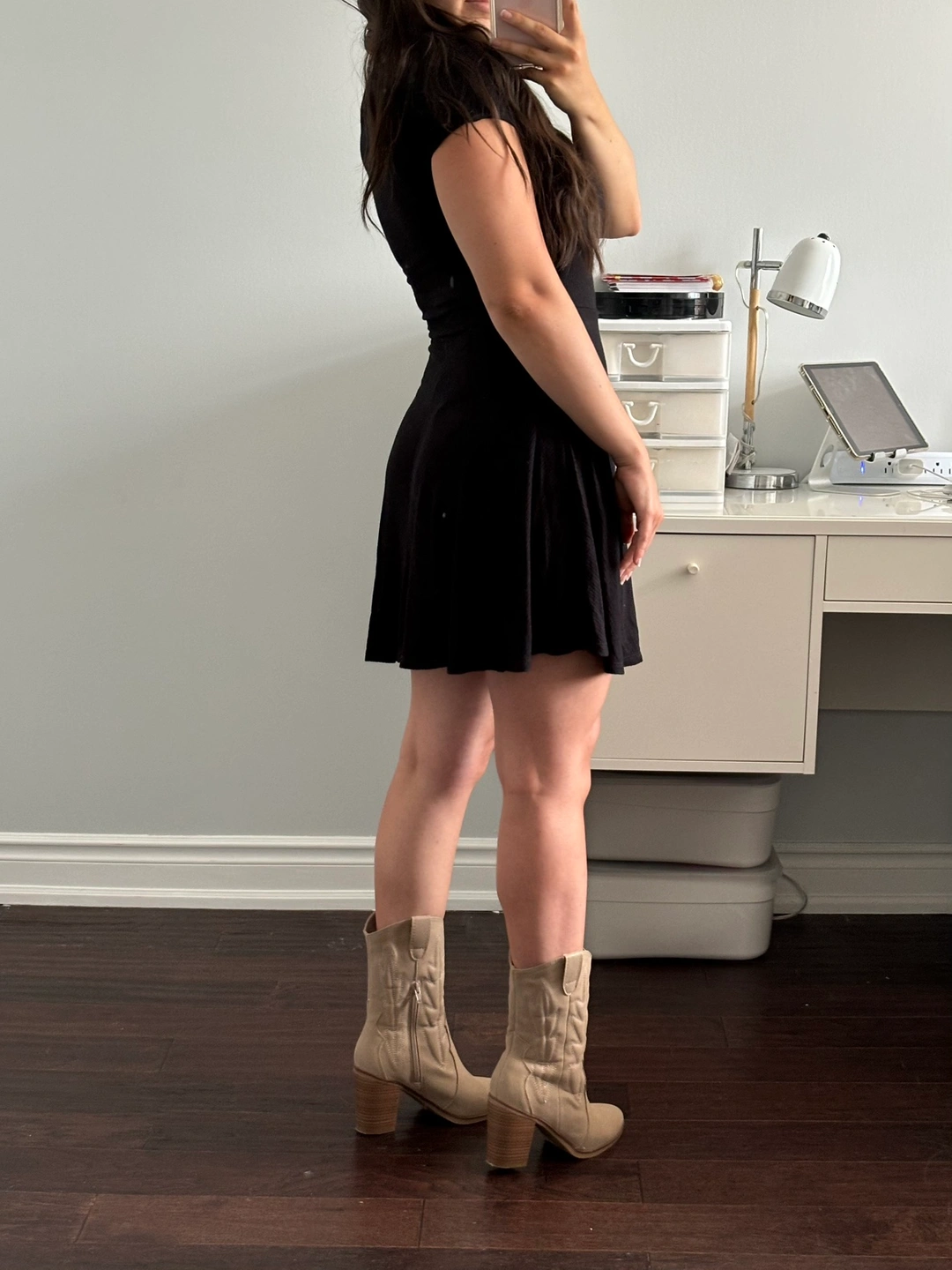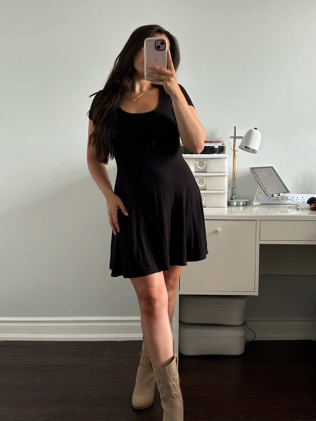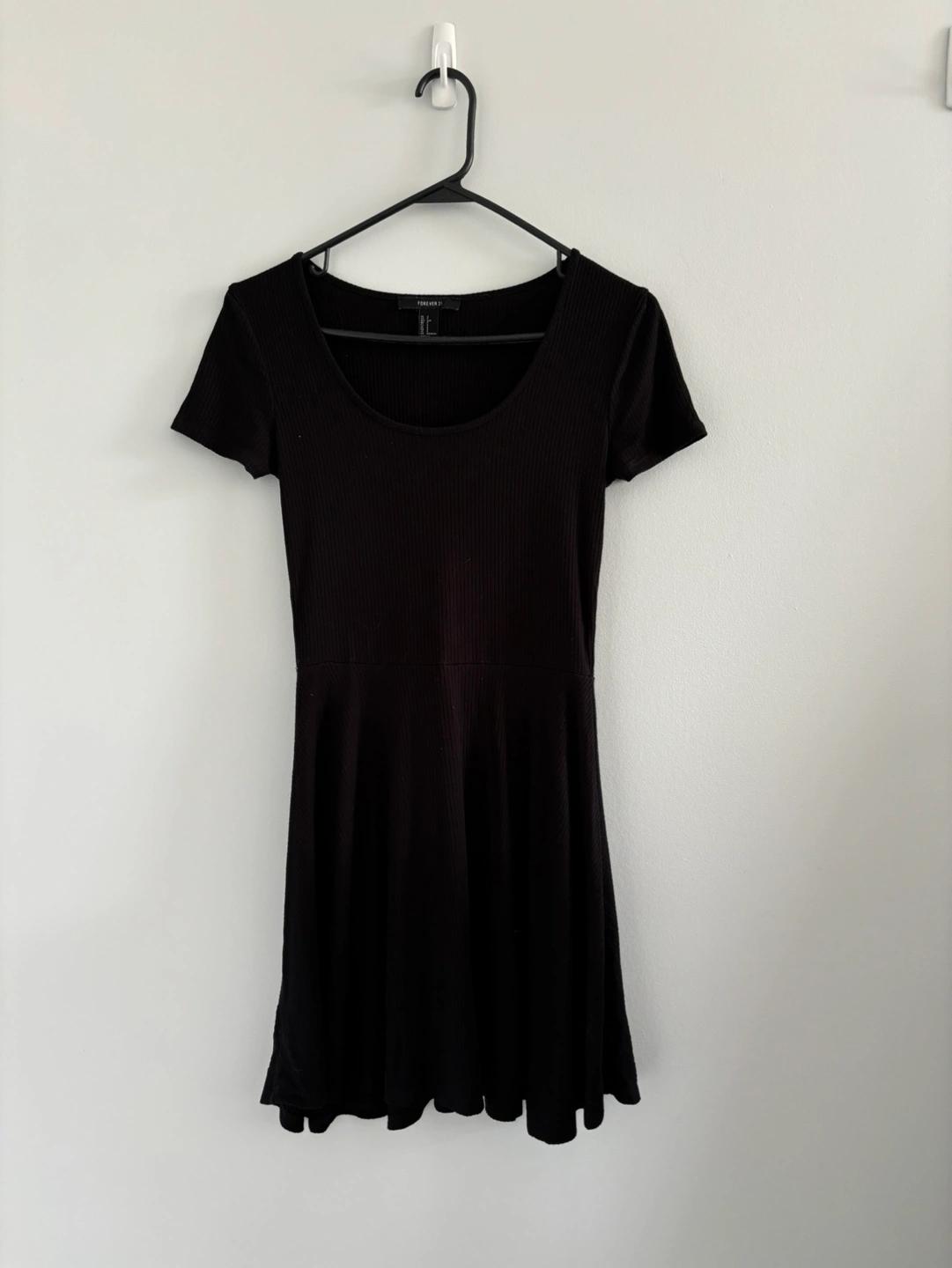 Short-sleeved, black skater dress from Forever 21. The dress features a scoop neckline and a fitted bodice. The skirt is a-line and hits above the knees. It is made of a soft and stretchy material. The dress is in good condition.