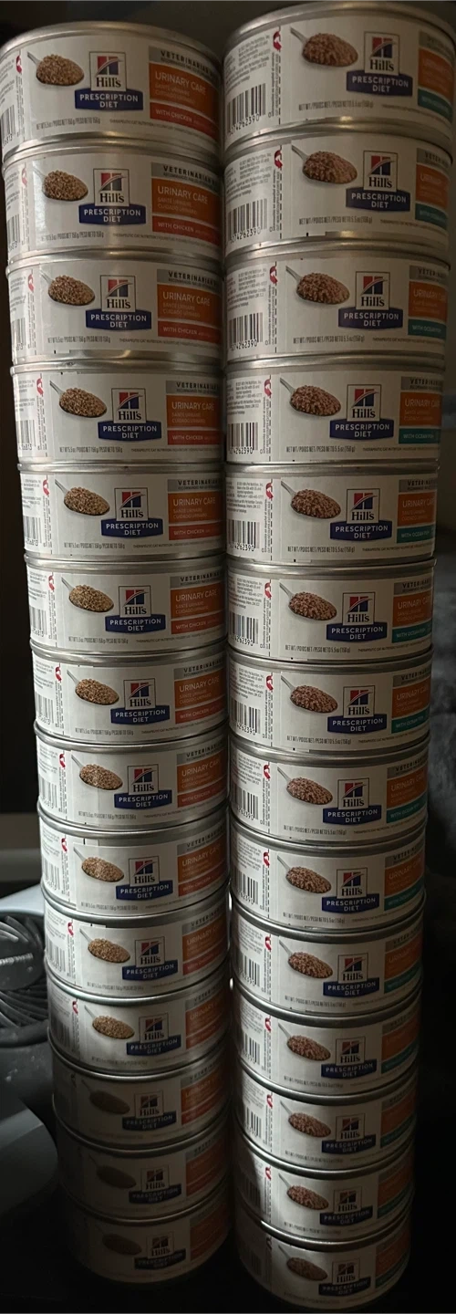 14 cans of Hill's Prescription Diet Urinary Care cat food with chicken and 14 cans of Hill's Prescription Diet Urinary Care cat food with ocean fish. It's veterinarian recommended for urinary health. Your kitty will thank you! Not sold in stores. Purchased from Kingston Humane Society.
