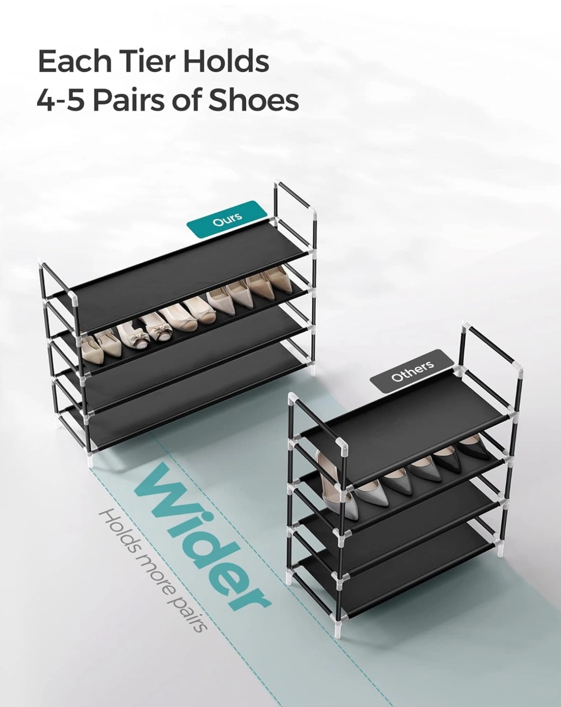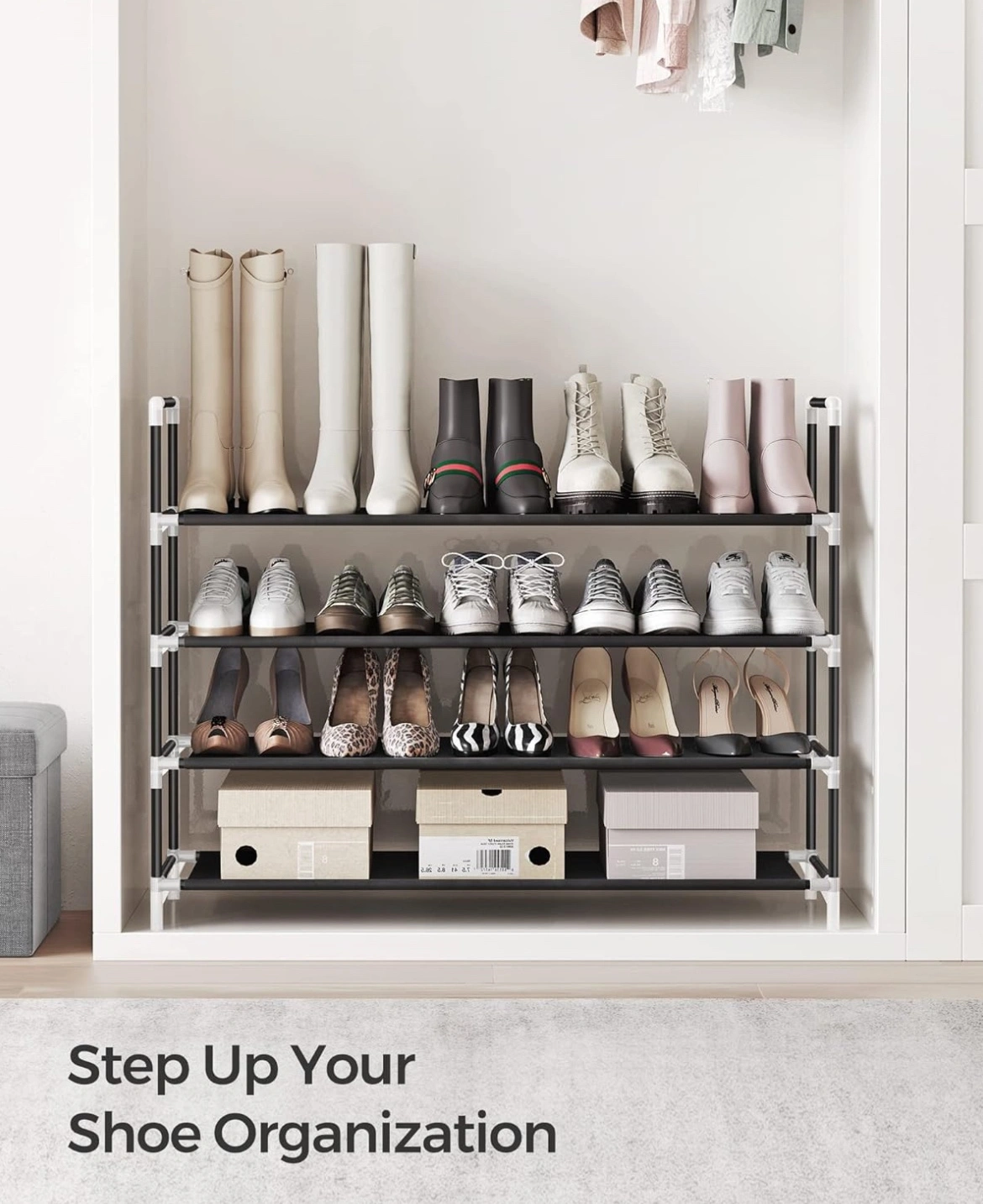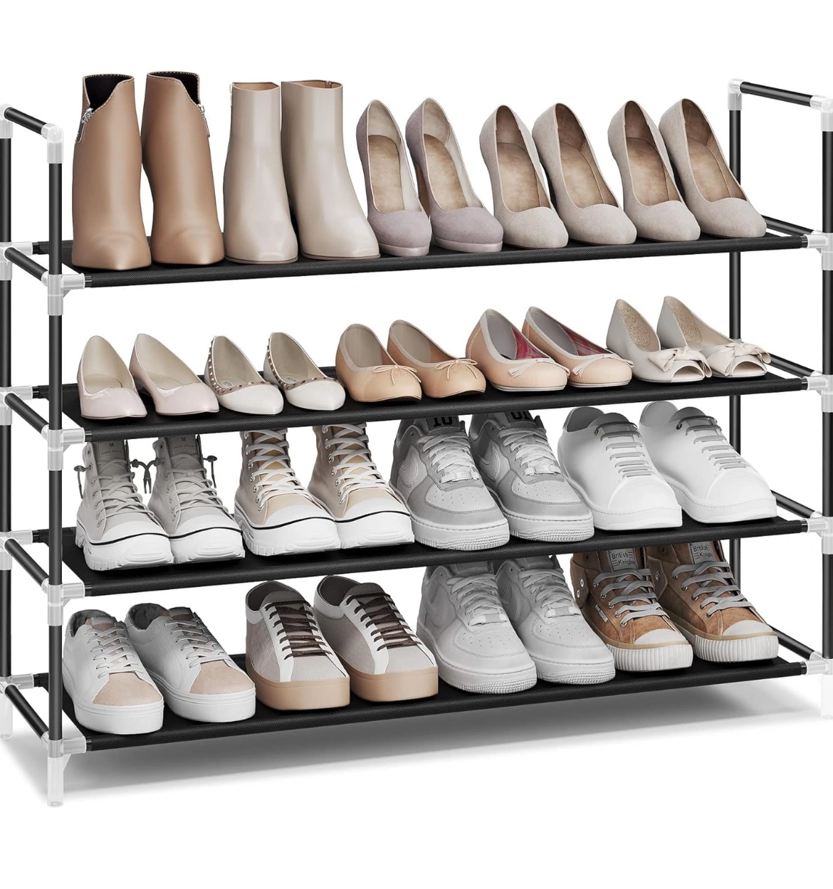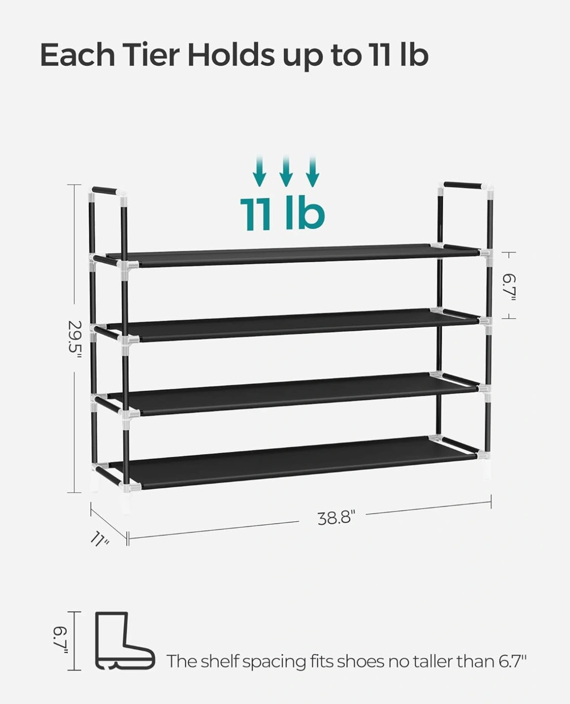 Brand new never used! A 4-tier shoe rack with a black fabric finish. The rack is 38.8" wide and 29.5" high.