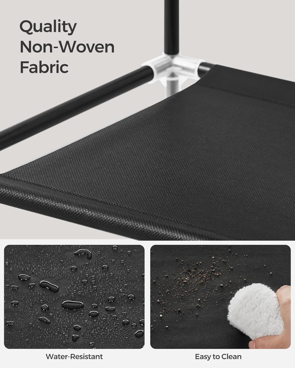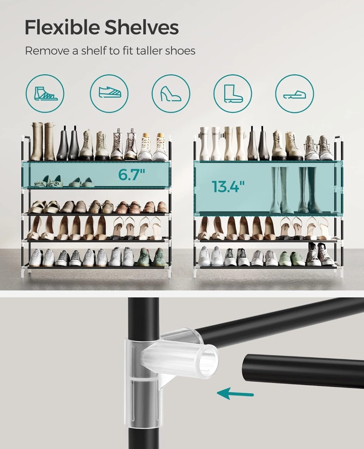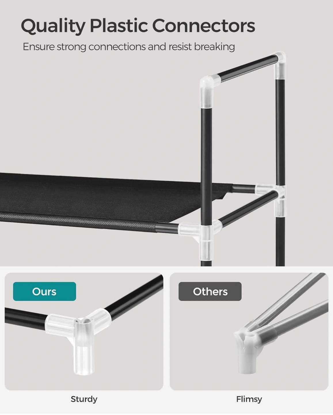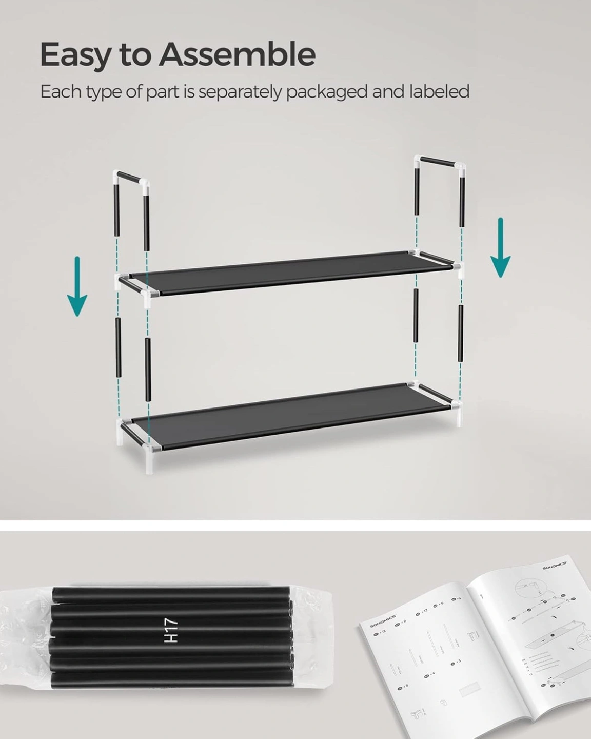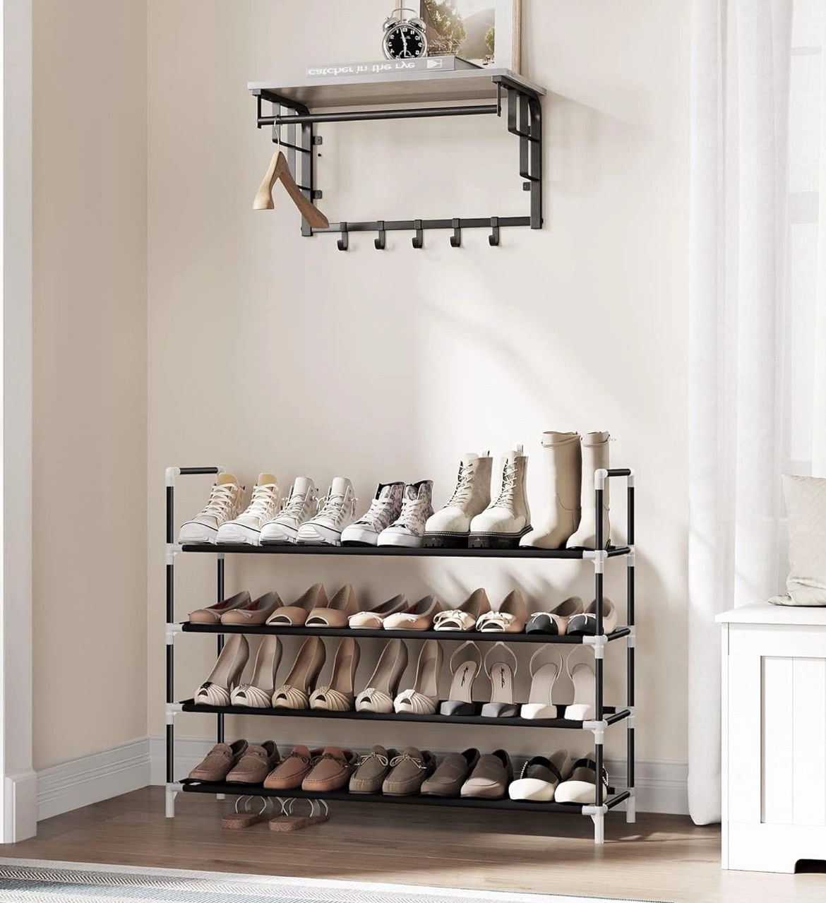 Brand new never used! A 4-tier shoe rack with a black fabric finish. The rack is 38.8" wide and 29.5" high.