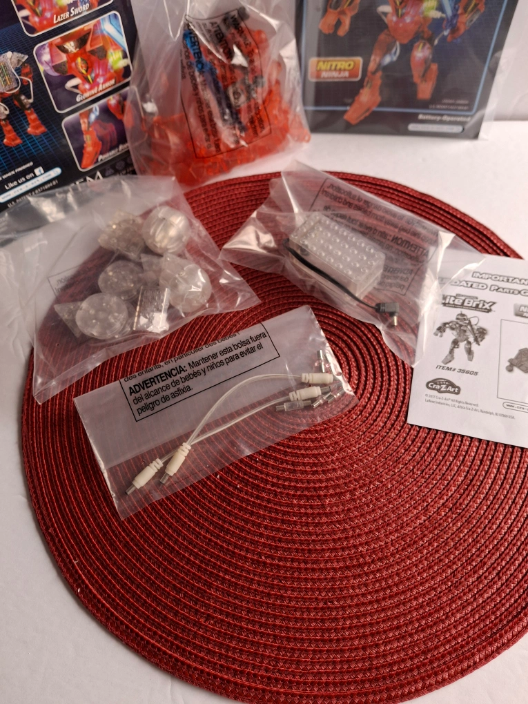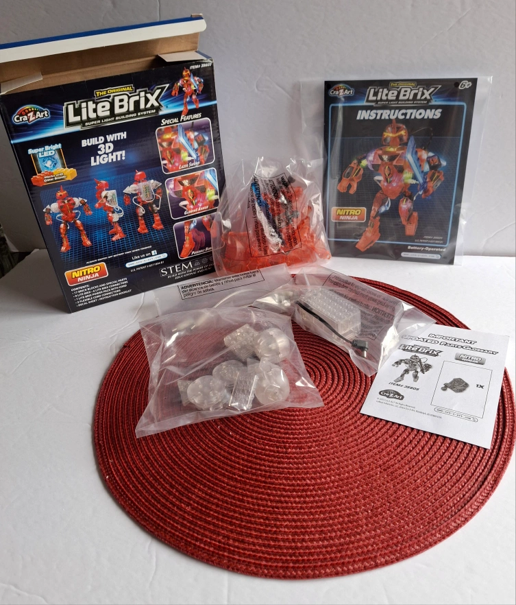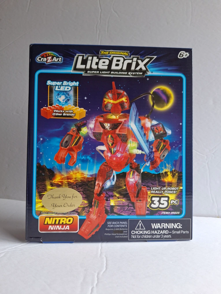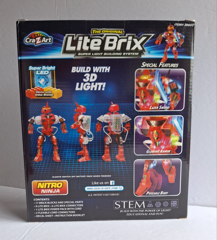 Rare Lite Brix Nitro Ninja light up Robot super light building system LED of 35 pieces. This toy is 3D Light, Glowing Armor with Lazer Sword andcPoseable Body.