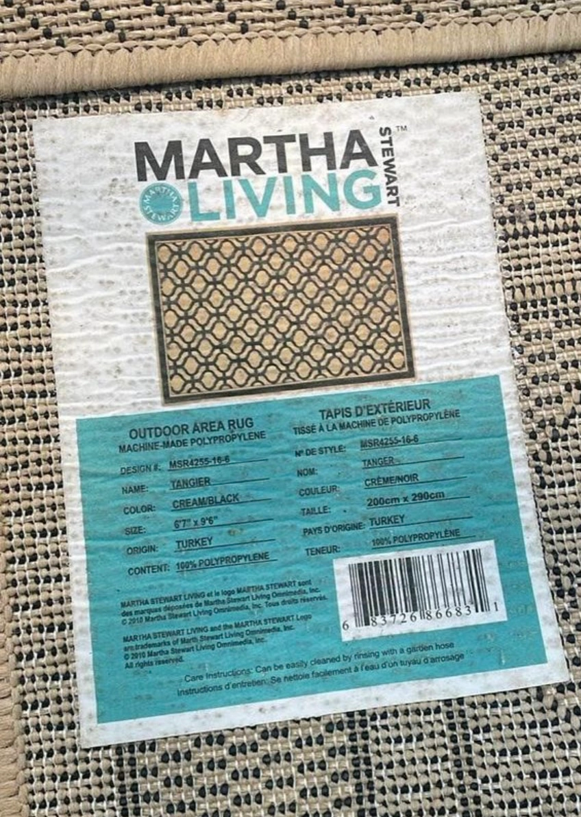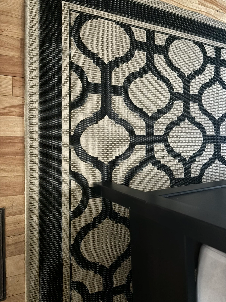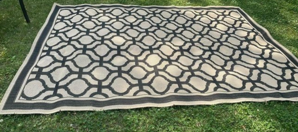 Large outdoor (or indoor) area rug featuring a cream and black geometric design. Made of polypropylene (feels like a real indoor rug, not plastic like typical outdoor rugs) The rug is in great condition! I bought it 2nd hand, but soon realized, it was too big for my space.