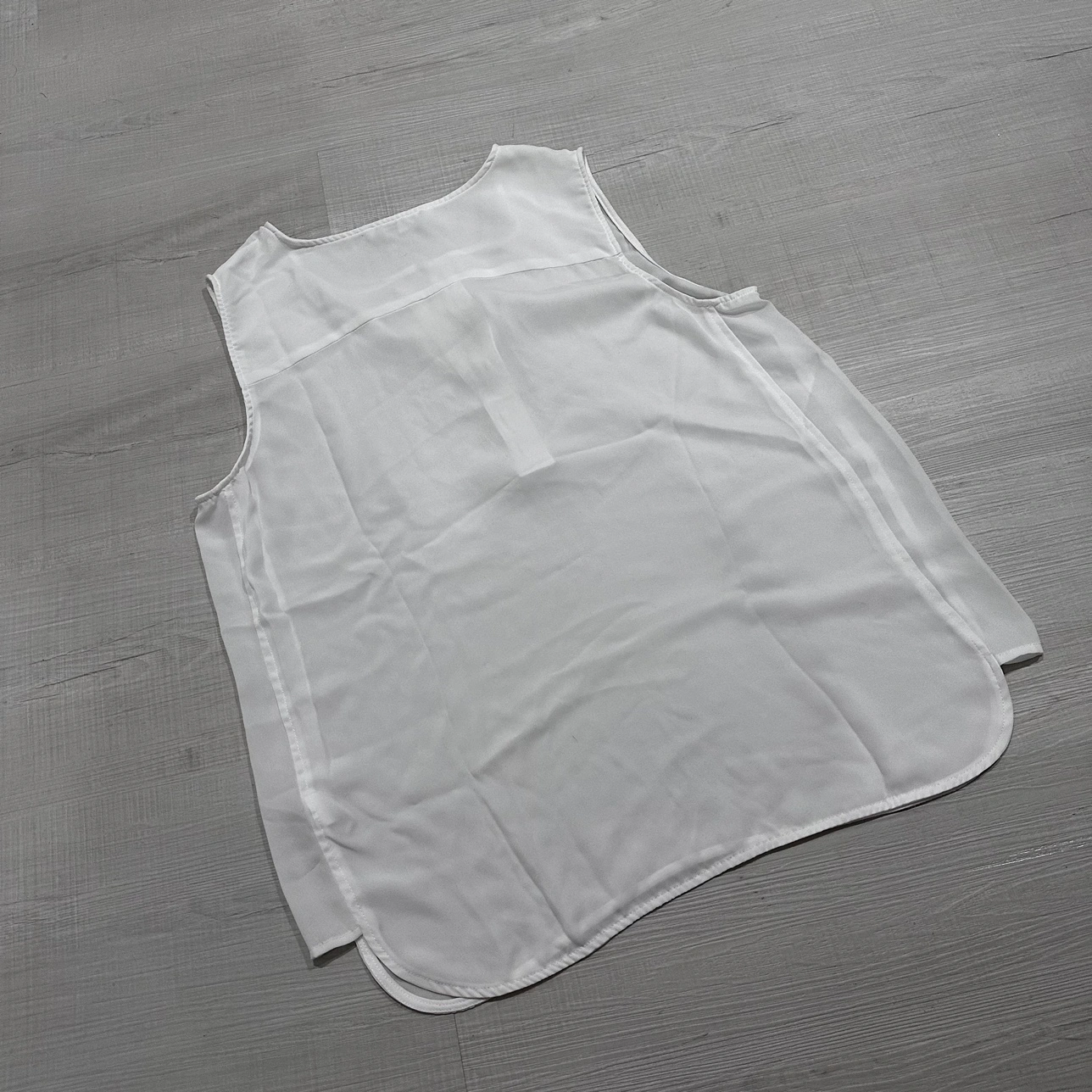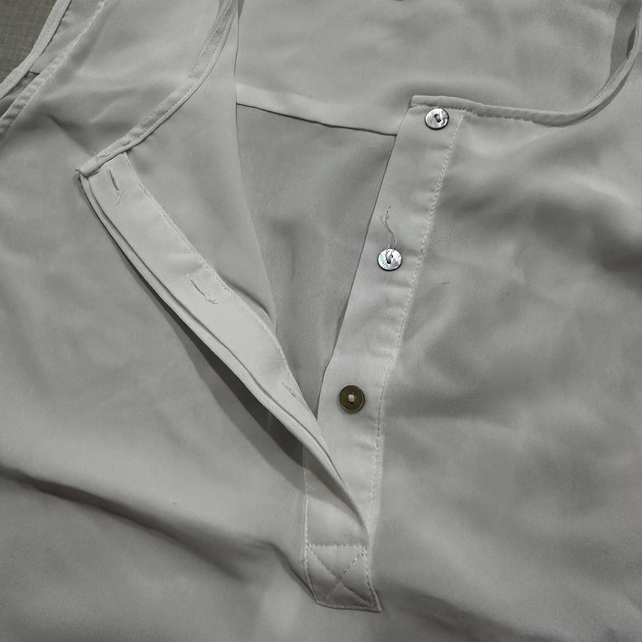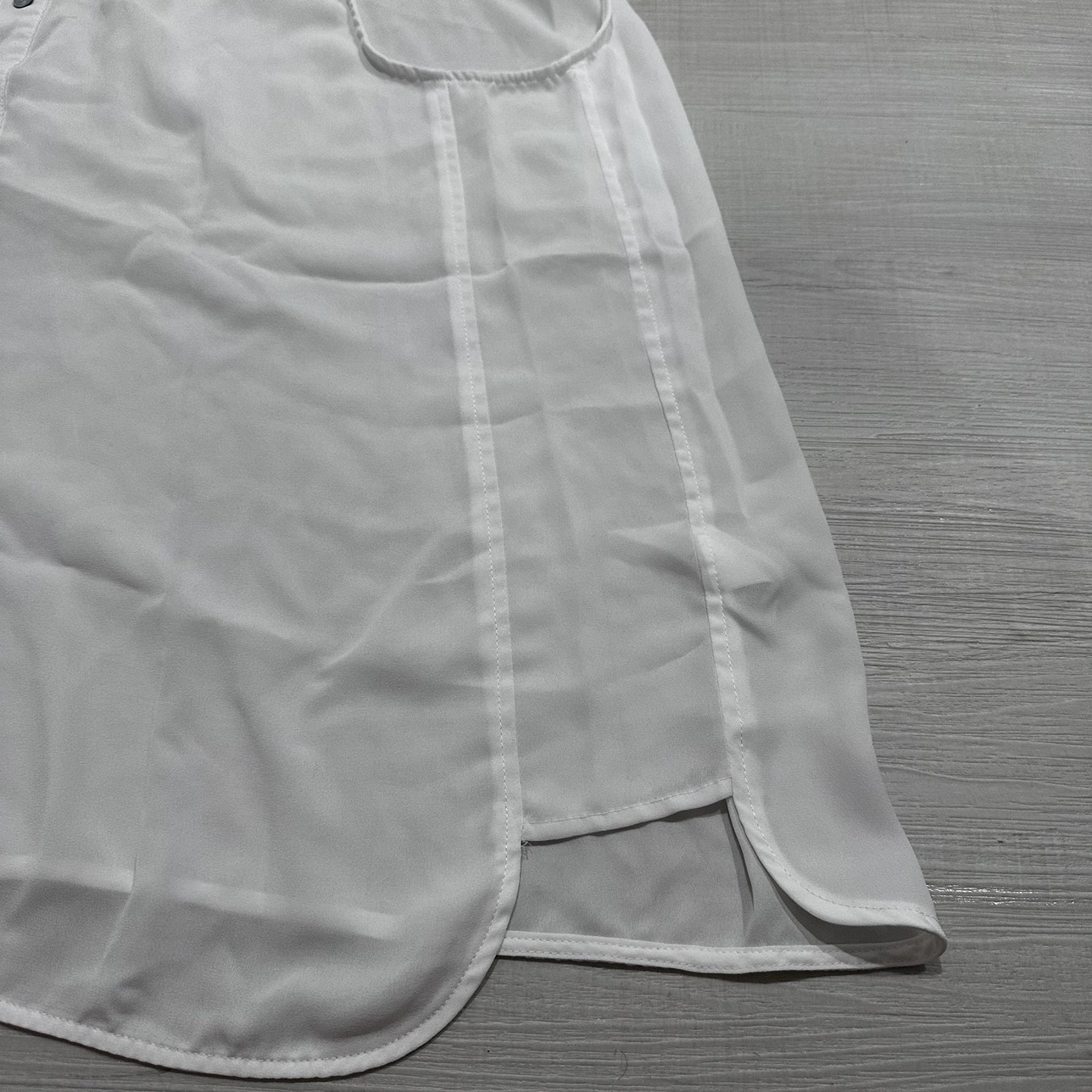 White sleeveless blouse by Violet + Claire Size Large Rounded neckline, a button closure on the front, and an asymmetric hem Fabric is lightweight and sheer