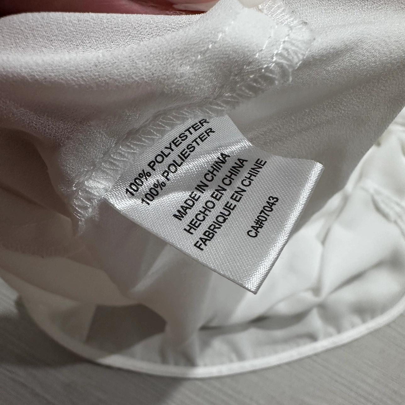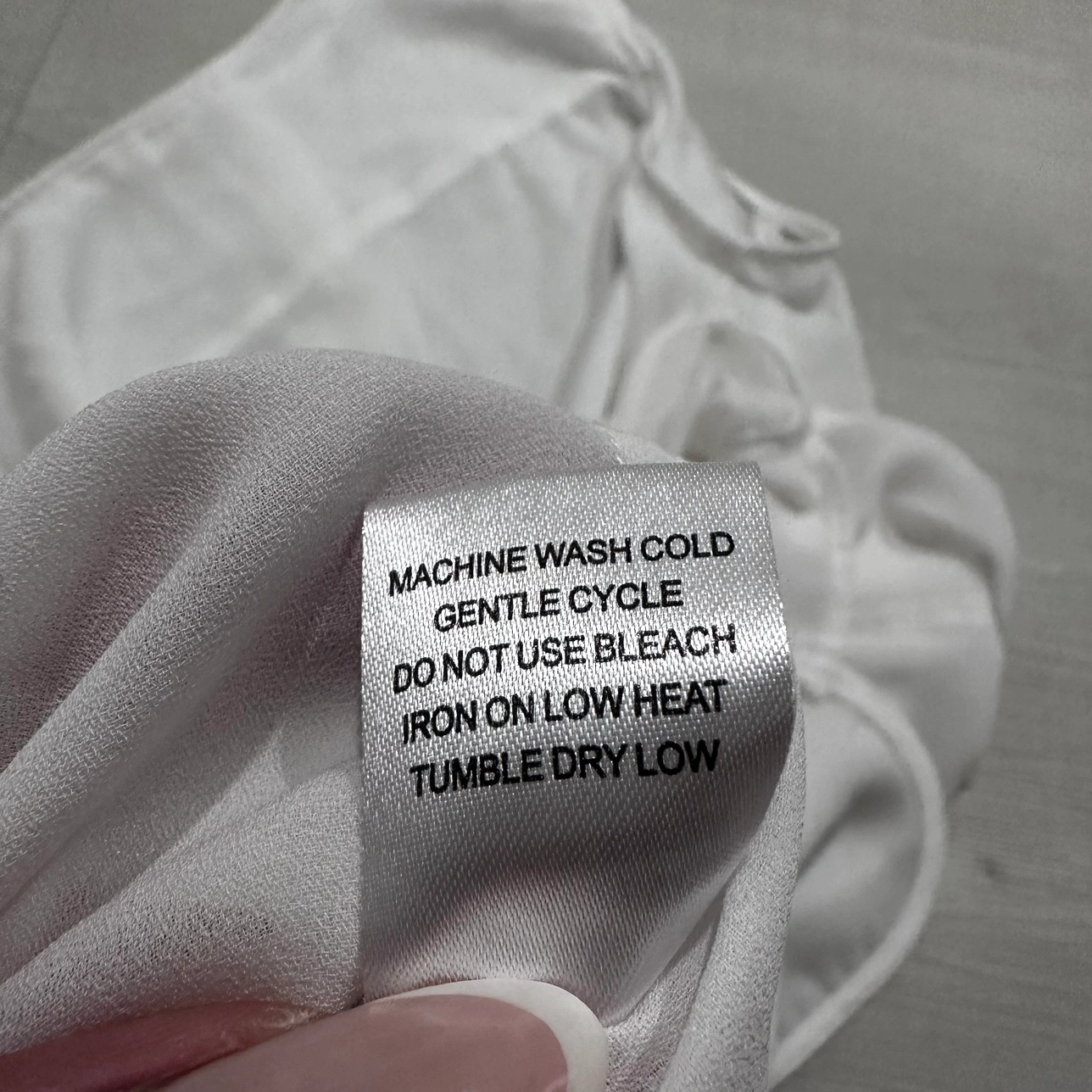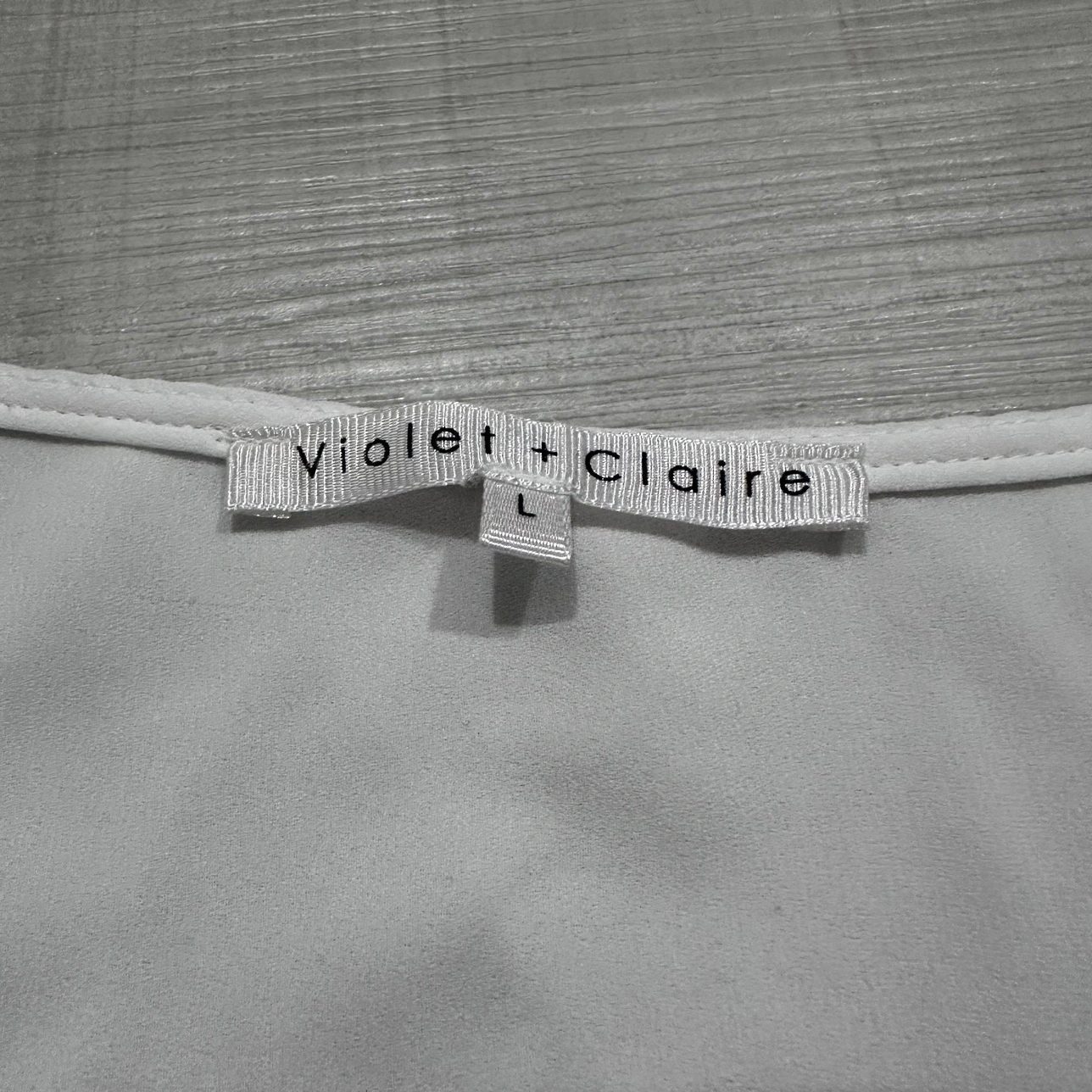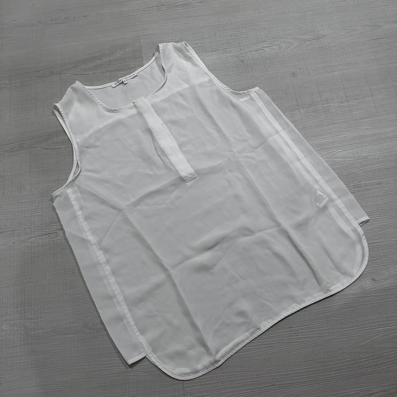 White sleeveless blouse by Violet + Claire Size Large Rounded neckline, a button closure on the front, and an asymmetric hem Fabric is lightweight and sheer
