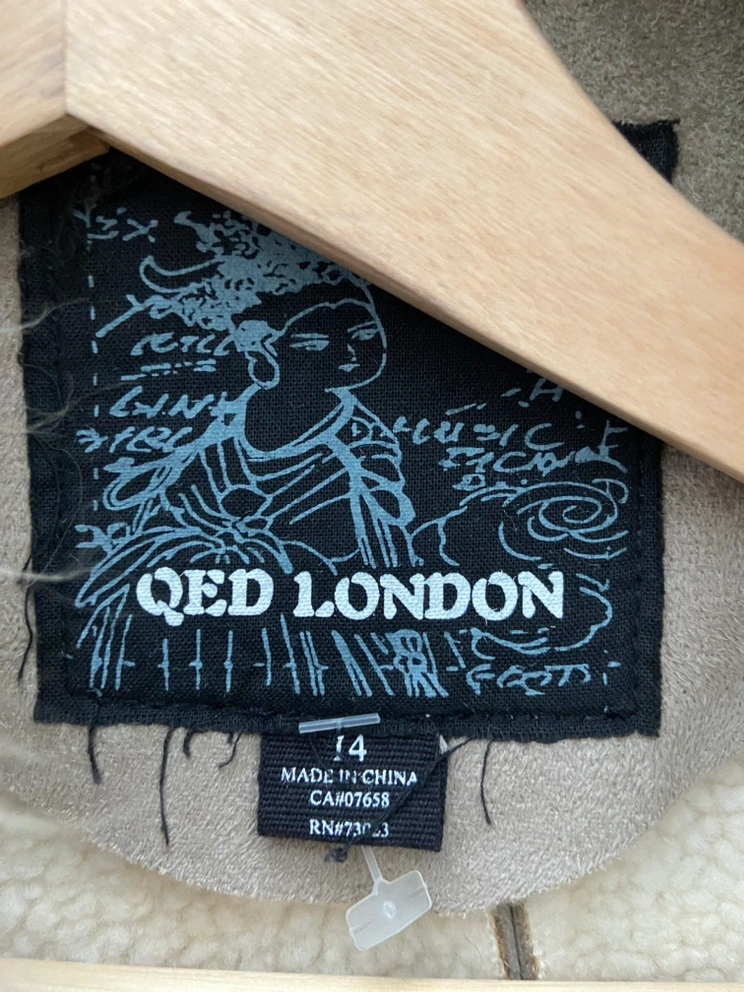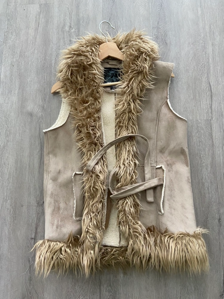 Tan faux suede vest with a faux fur collar, lining and trim. The vest has a tie at the waist.