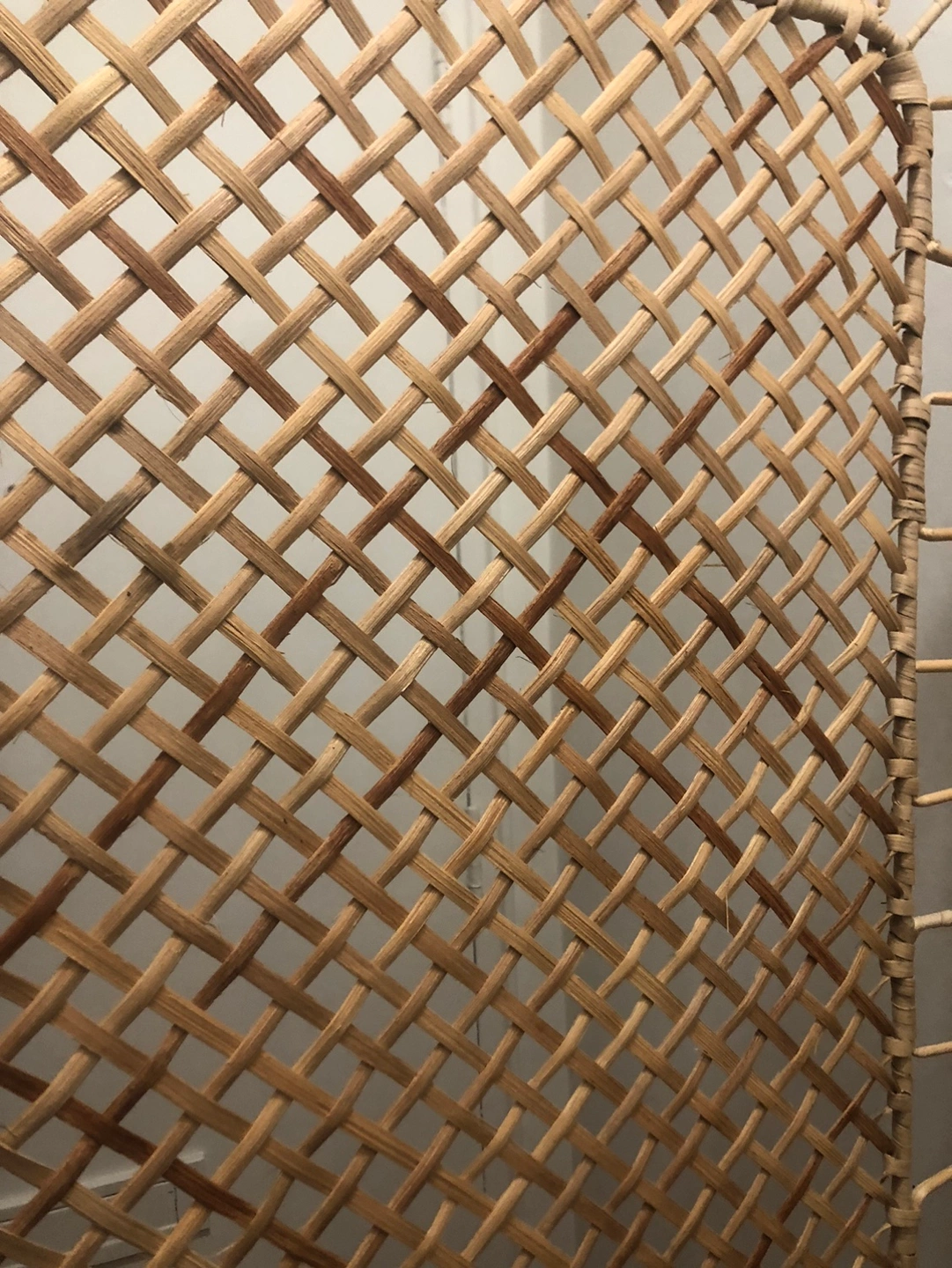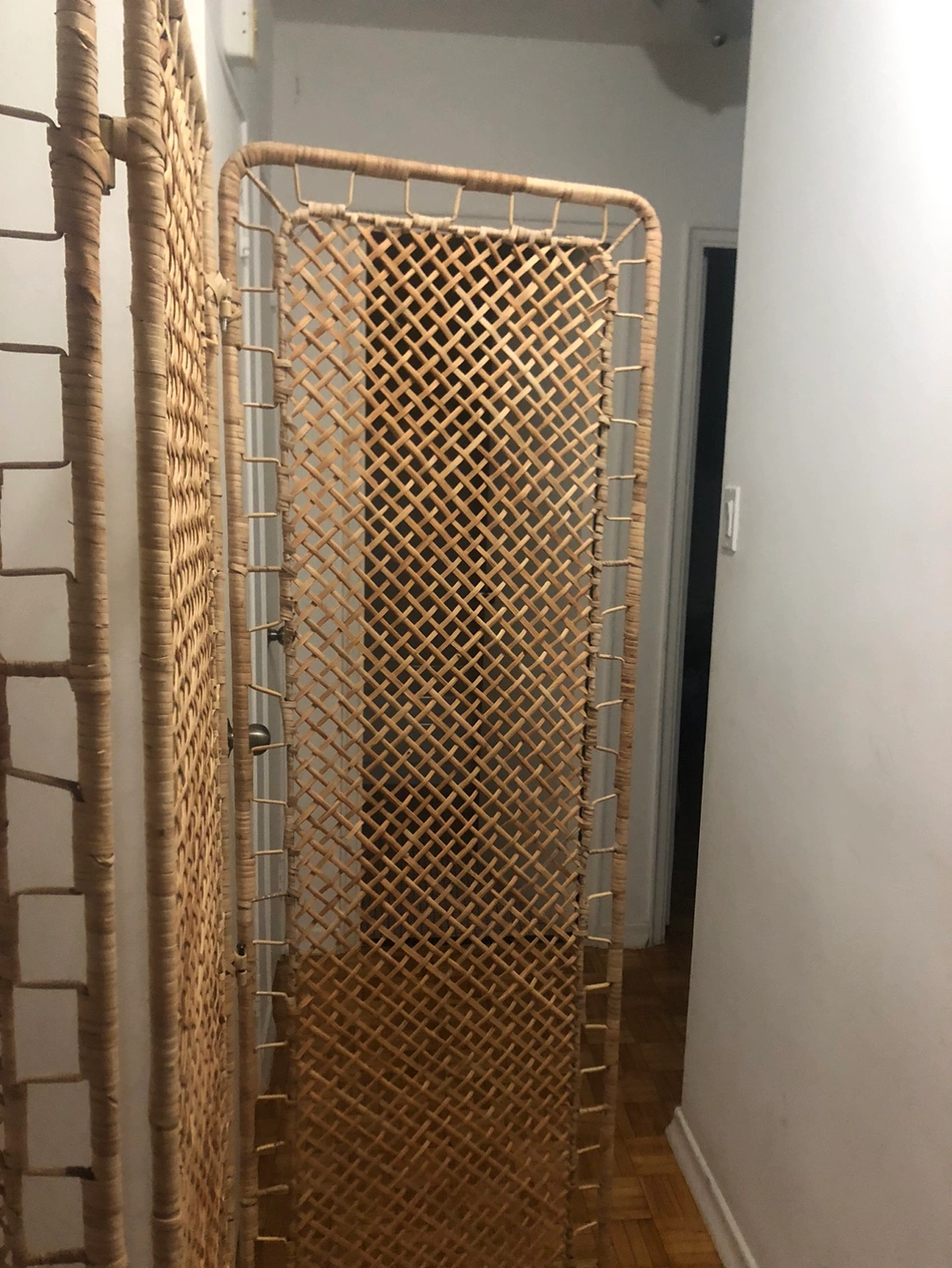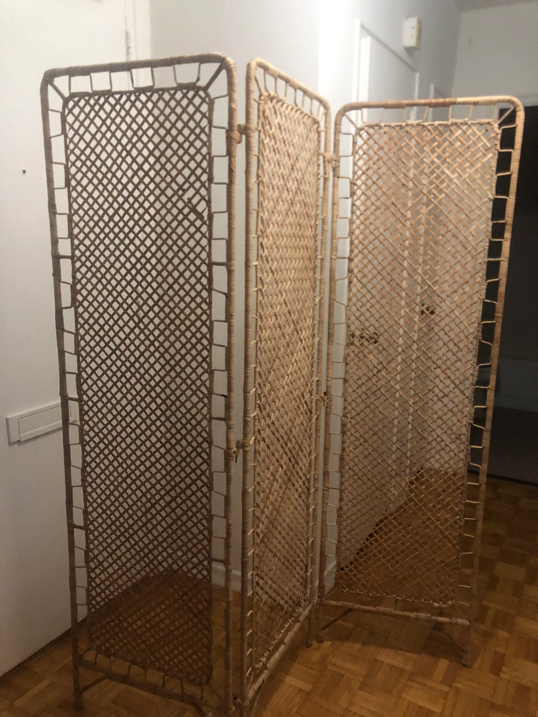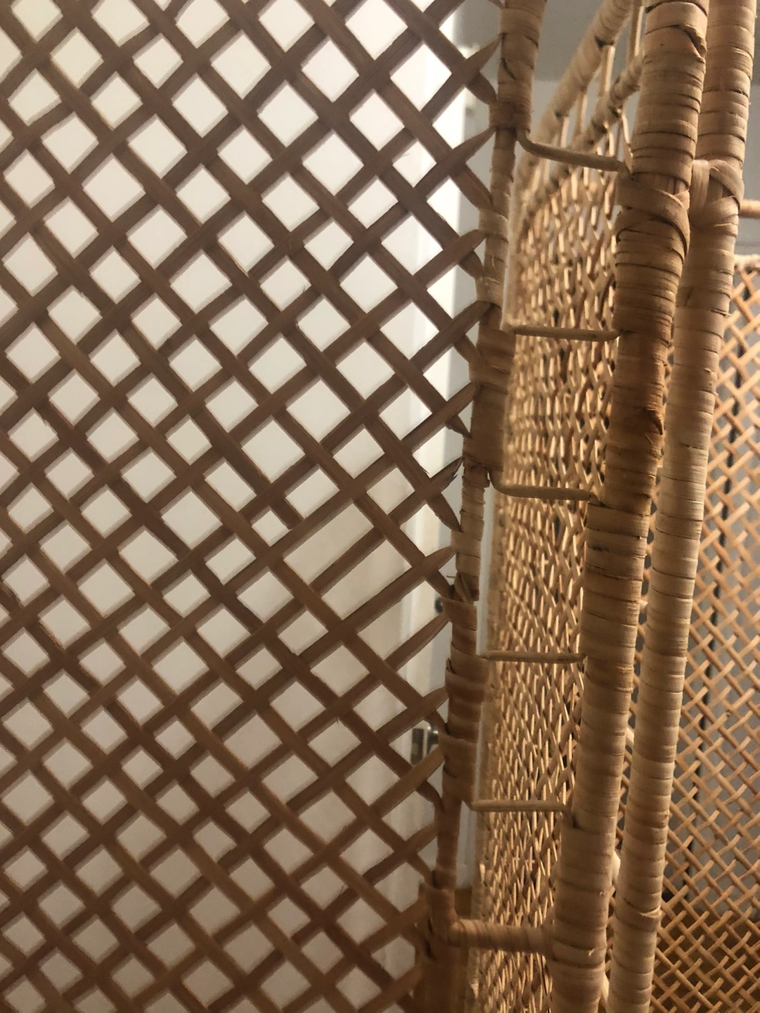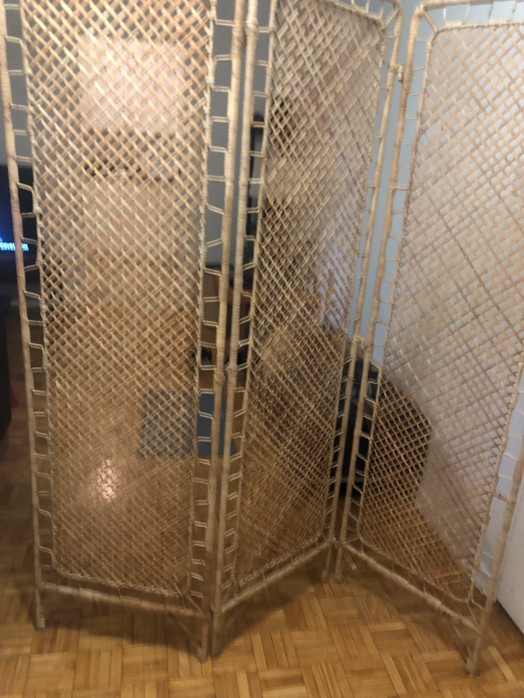 Three panel room divider made of woven rattan. 67 inch/height. Only have 3 of original pins, used 3 screws for photos. One small area with missing rayan strip, shown in picture 6.