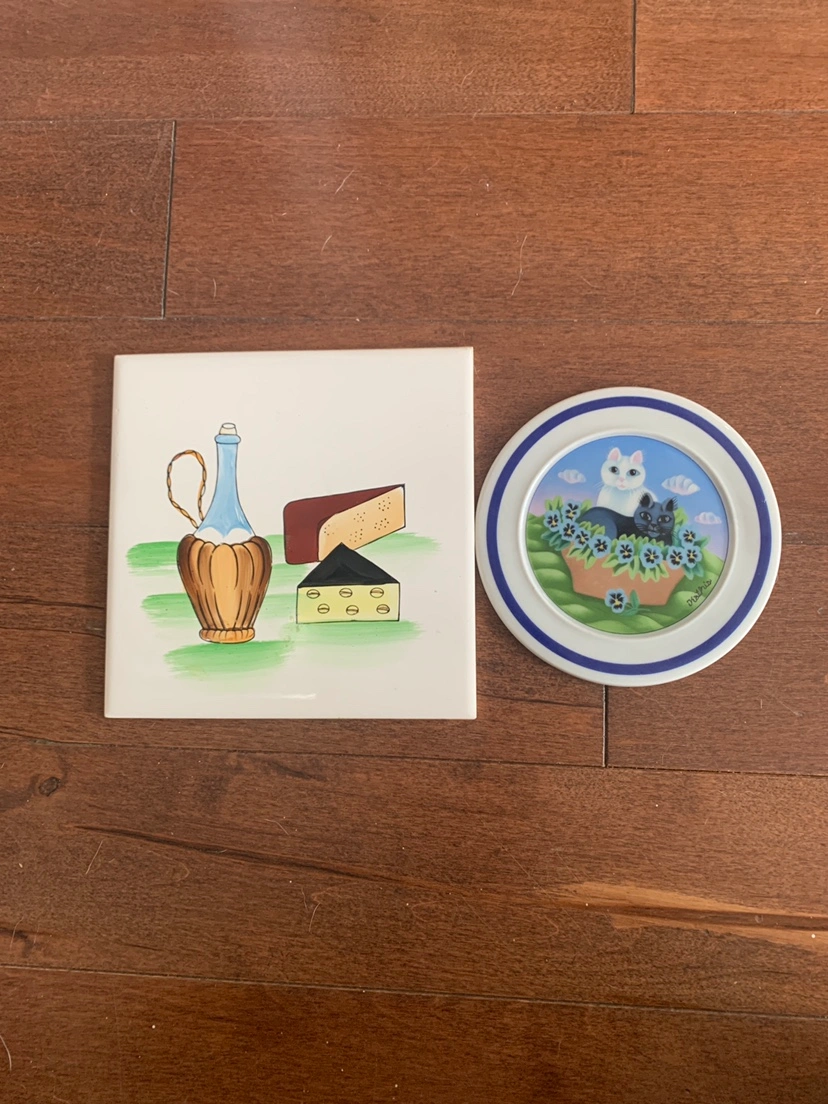 Left square tile made in Japan depicting a bottle and cheese, and the right round tile is a vintage Porcelain Blue Cat Ornament Kathia Berger Kathia's Cats Arzberg Germany. Meet up dt/east york
