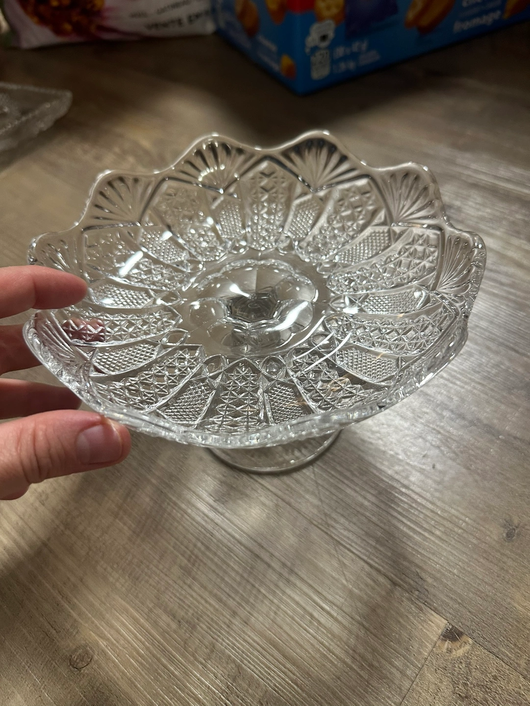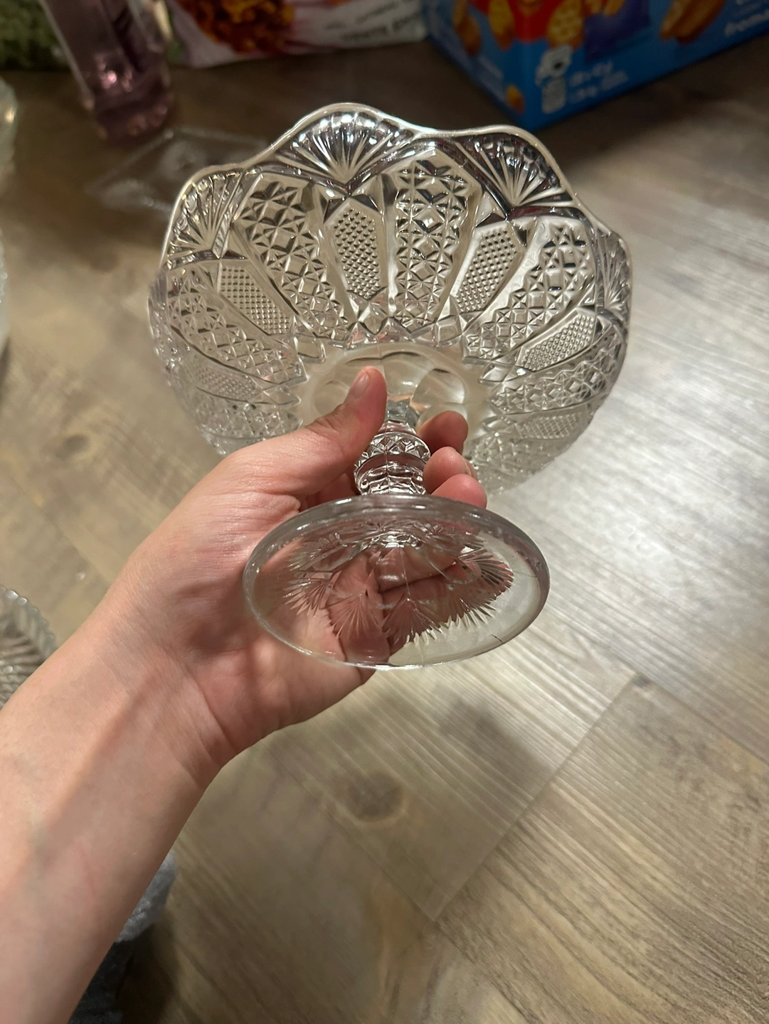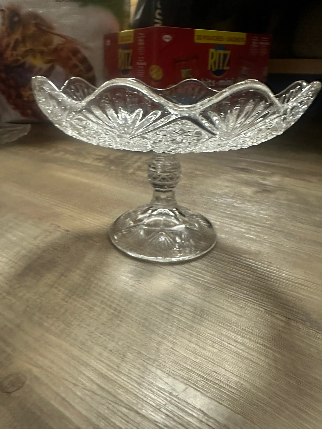 Elegant cut glass serving bowl with a footed stand. Perfect for displaying fruit, candies or other treats.