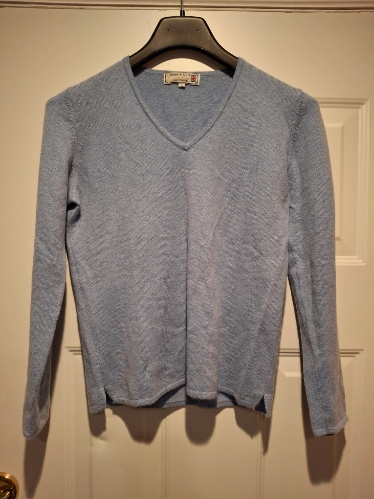 Banana Republic Sleeveless Top - Small Pink and White pattern. Cashmere V-neck Sweater - Large Light Blue Eddie Bauer Fleece Jacket - Medium Black and Grey 10 for all