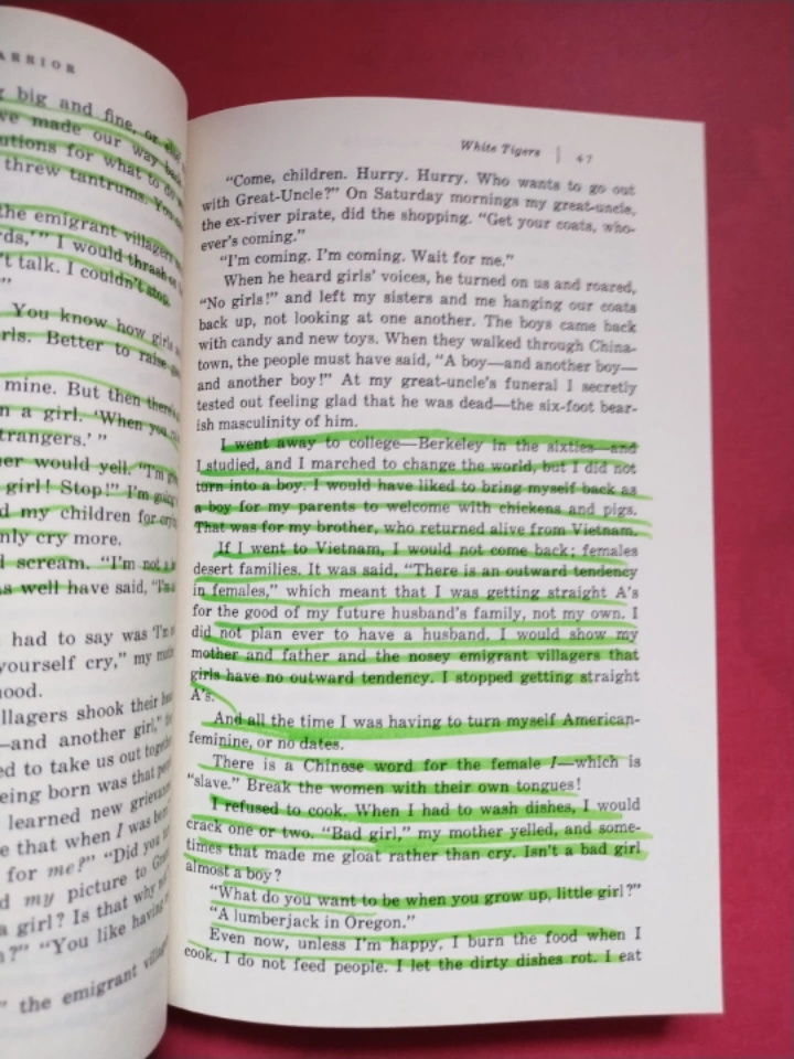 A paperback copy of Maxine Hong Kingston's The Woman Warrior, published by Vintage International. used book in good condition with highlights in it.